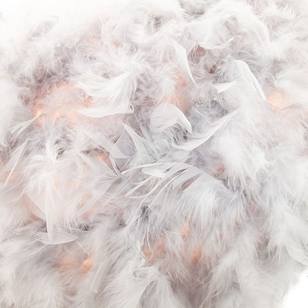 Contemporary and designer-look non-electrical pendant light shade with open top and bottom. Features unique and eye-catching 100% real natural grey feather shade. Creates a stunning effect when the light shines through. The product dimensions are: Height - 20cm, Depth - 25cm, Width - 25cm. We recommend blowing the feathers with a hairdryer on a cold setting to fluff up the feathers after being packaged tightly for protection. Maximum wattage allowed is 40w. Please note that ceiling rose and cable is not included - pendant shade only being sold. Complete with shade reducer ring allowing for most lamp bases - B22/BC, E14/SES and E27/ES. Light bulb not included.
