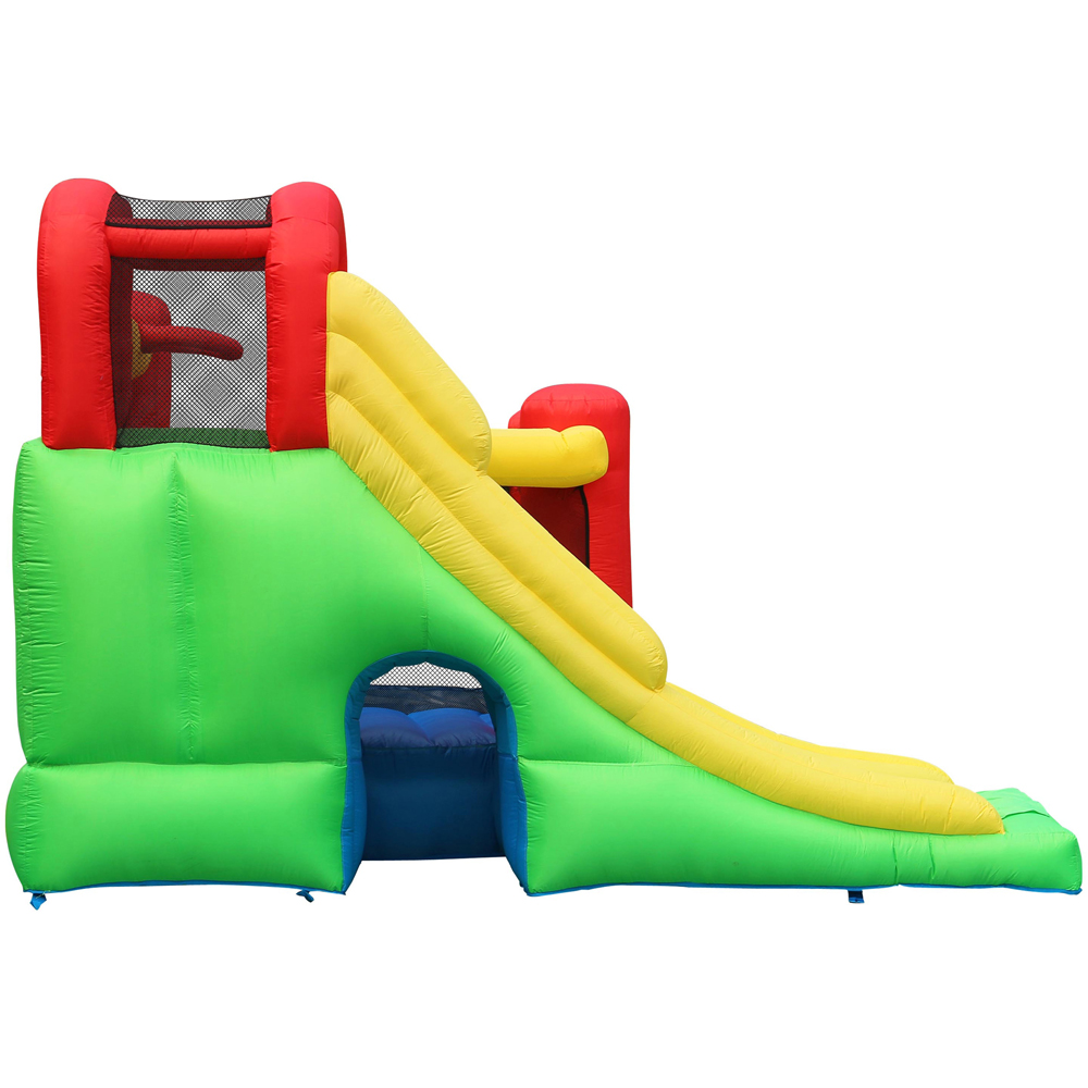 Step right up and dive into the action with the Happy Hop 6 in 1 Playcentre. Get ready for non-stop excitement as kids traverse through the tunnel and bounce in the secure netted space. They can test their skills at the basketball hoop, working together to score big. Watch them leap and bound to the inflatable climbing wall, then brave the climb to zoom down the slide. With the added fun of a ball pit, the adventures are endless. Powered by a reliable air blower, this play centre ensures constant airflow for uninterrupted fun. Ground anchors keep the structure secure, while the included repair kit stands ready for any unexpected hiccups. Easy to deflate, fold, roll, and pack into its carry bag for convenient storage and transport.
