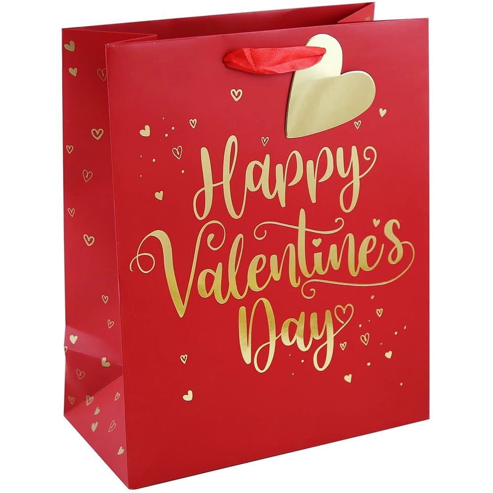Add an extra special finishing touch to your gifts this Valentine's Day with this fantastic Happy Valentines Bag. This large gift bag is excellent for concealing a variety of gifts from teddys, perfume, chocolate and more. Finished with beautiful gold foil script writing, red ribbon handles and a gold heart gift tag, this sensational gift wrap solution is guaranteed to delight.