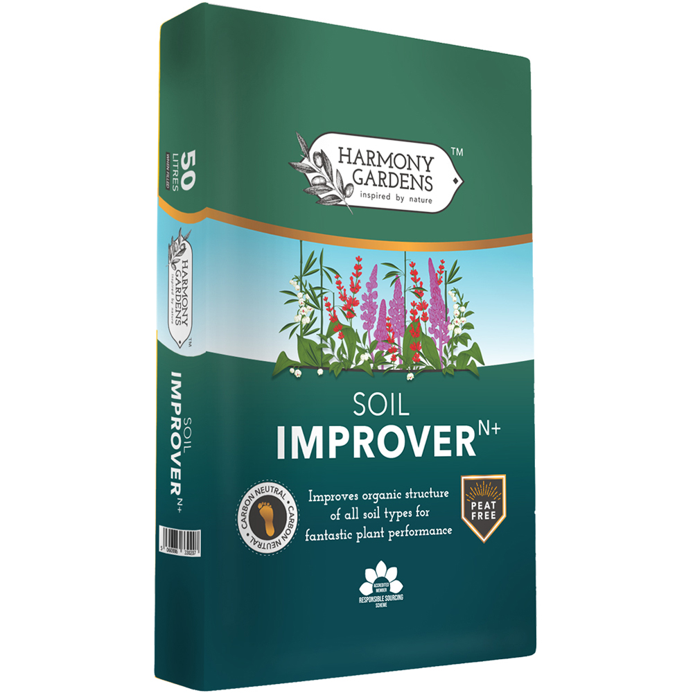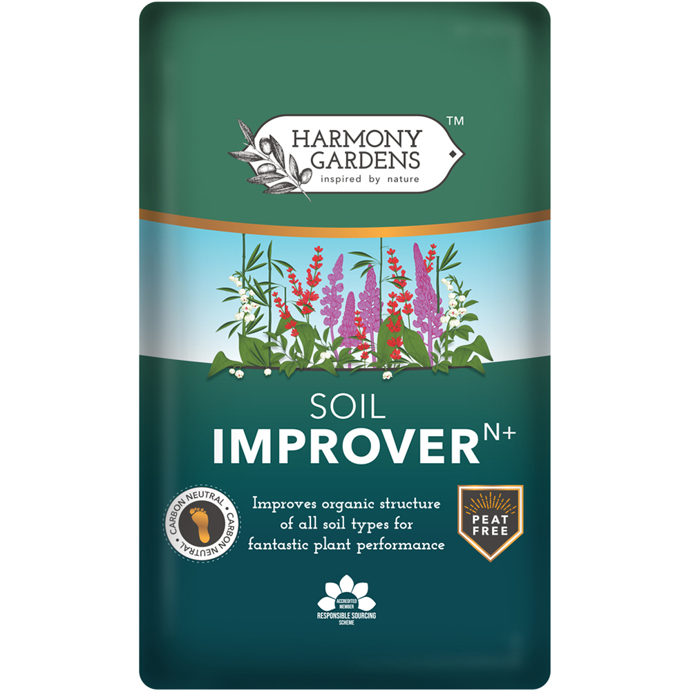 Made from green compost blended with recycled wood fibre which releases additional nitrogen back to the plants. Stabilise and improve the texture of your soil to create the perfect conditions for plant root development and healthier plants. All peat-free, local, responsibly sourced ingredients using either by-products or recycled material. Harmony Gardens Soil Improver N+ is perfect for mulching around plants or digging into the soil to improve soil structure and support healthy root and plant development. Using fine screening to ensure an even, perfect texture for heavy clay soils or light sandy soils alike. Great for your garden, kinder to the earth. Harmony Gardens Soil Improver 50L Peat-Free NPK Top Soil Fertiliser. Improve root growth for future planting success. Improve soil structure and regulate draining in both clay and sandy soils. Use 100% natural organic ingredients to replenish nutrients in nutrient poor overworked soil. Enhance and restore the natural balance of healthy soil. Replenish nutrients in nutrient poor soil.