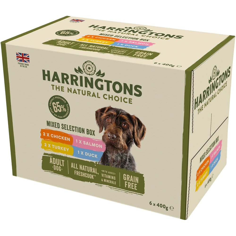 Delight your dog with the balanced nutrition of the Harringtons Mixed Selection Complete Adult Dog Food 400g 6 Pack. These tasty tray-cooked dinners are crafted to provide your adult dog with a healthy diet. Featuring 100% natural ingredients enriched with vitamins and minerals, this grain-free selection will surely become your dog's favourite. Flavours include chicken, salmon, turkey, and duck. Feeding Instructions: Size of Dog: Toy (up to 5kg), Fed on its own: 1/2 tray, With dry food: Up to 1/4 tray; Size of Dog: Small (5-12kg), Fed on its own: 1-2 trays, With dry food: Up to 1 tray; Size of Dog: Medium (12-25kg), Fed on its own: 2-3 trays, With dry food: Up to 1 1/2 trays; Size of Dog: Large (25-45kg), Fed on its own: 3-5 trays, With dry food: Up to 2 1/2. Composition: Chicken with potato and vegetables: Chicken 65% (26% freshly prepared chicken). Turkey with potato and vegetables: Turkey and chicken 65% (26% freshly prepared turkey). Salmon with potato and vegetables: Salmon and chicken 65% (26% freshly prepared salmon). Duck with potato and vegetables: Duck and chicken 65% (26% freshly prepared duck). Vegetables 14% (potato, peas and carrot), vitamins and minerals, salmon oil, sunflower oil, dried tomato (0.15%), seaweed (0.08%), green lipped mussel (0.05%), chicory (0.05%), parsley (0.05%), basil (0.05%), green tea (0.01%), rosemary (0.01%), rosehip (0.01%). Nutritional Additives: Vitamin A 3000 IU, Vitamin D3 420 IU, Vitamin E 40mg, Zinc (as Zinc Sulphate Monohydrate) 38.57mg, Manganese (as Manganous Sulphate Monohydrate) 3.75mg, Iodine (as Calcium Iodate Anhydrous) 0.39mg, Selenium (as Sodium Selenite) 0.04mg. Technological Additives: Cassia Gum 3000mg.