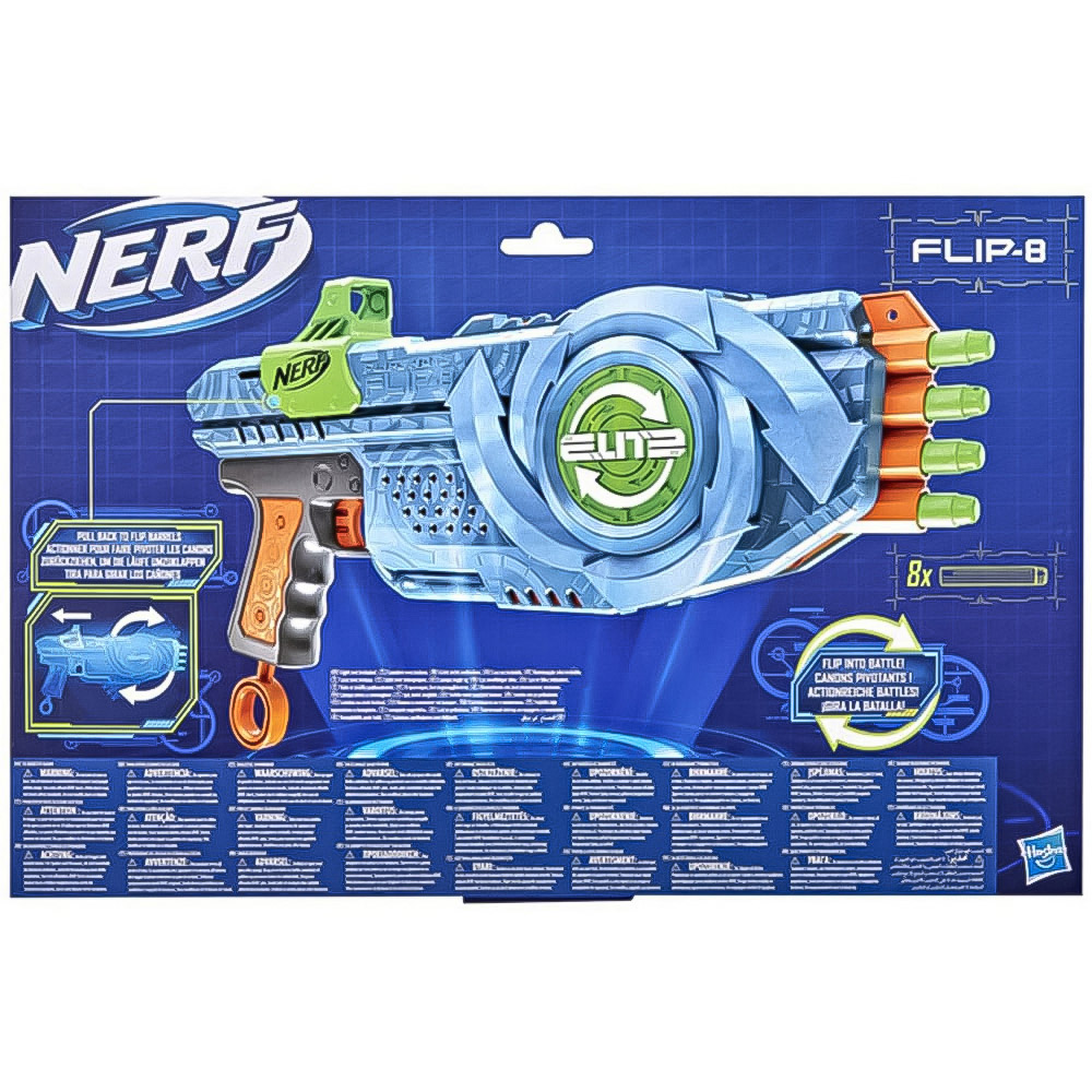 The Nerf Elite 2.0 Flipshots blaster has barrels that face front and face back. Fire darts from the front barrels then flip the rear barrels forward. The back-to-back barrels are connected, making it quick and easy to rotate them. Complete with eight Official Nerf darts, the blaster features eight dart capacity. Simple to use, pull the handle to make the rear barrels flip forward.