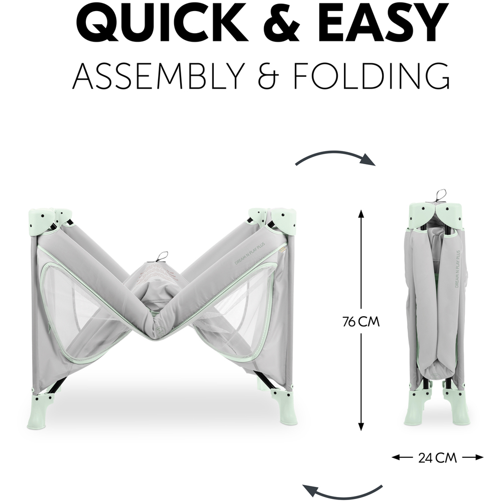 Comfortable travel cot and playpen at the same time. Security for day and night. When you travel, everything is unfamiliar. The Dream N Play Plus travel cot offers security in a timeless design for your little one (up to 15 kg) and is the perfect place to play on the go as a playpen. Easy and quick to assemble and fold. The Dream N Play Plus's special mechanism makes things simple for you. You can easily set it up and fold it up again. Easy to transport with a transport bag. Space-saving, practical and colour-coordinated, the Dream N Play Plus can be perfectly stored in the accompanying transport bag. And it's easy to take with you. Large access hatch for little explorers. Children want to explore everything up close. The Dream N Play Plus has a large access hatch that you can open from the outside. This makes it possible for your child to crawl out of bed on their own. The two large mesh inserts allow the air to circulate particularly well and create a pleasant sleeping environment. And you can keep an eye on your child at all times.