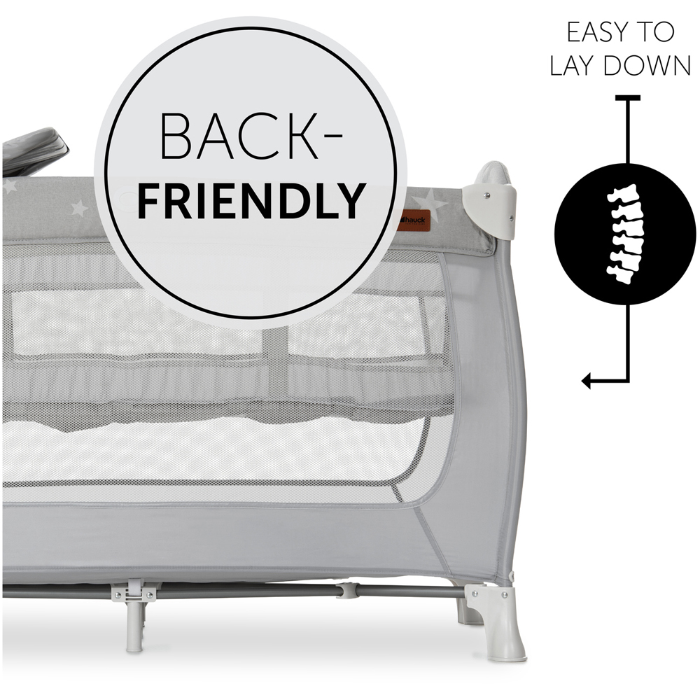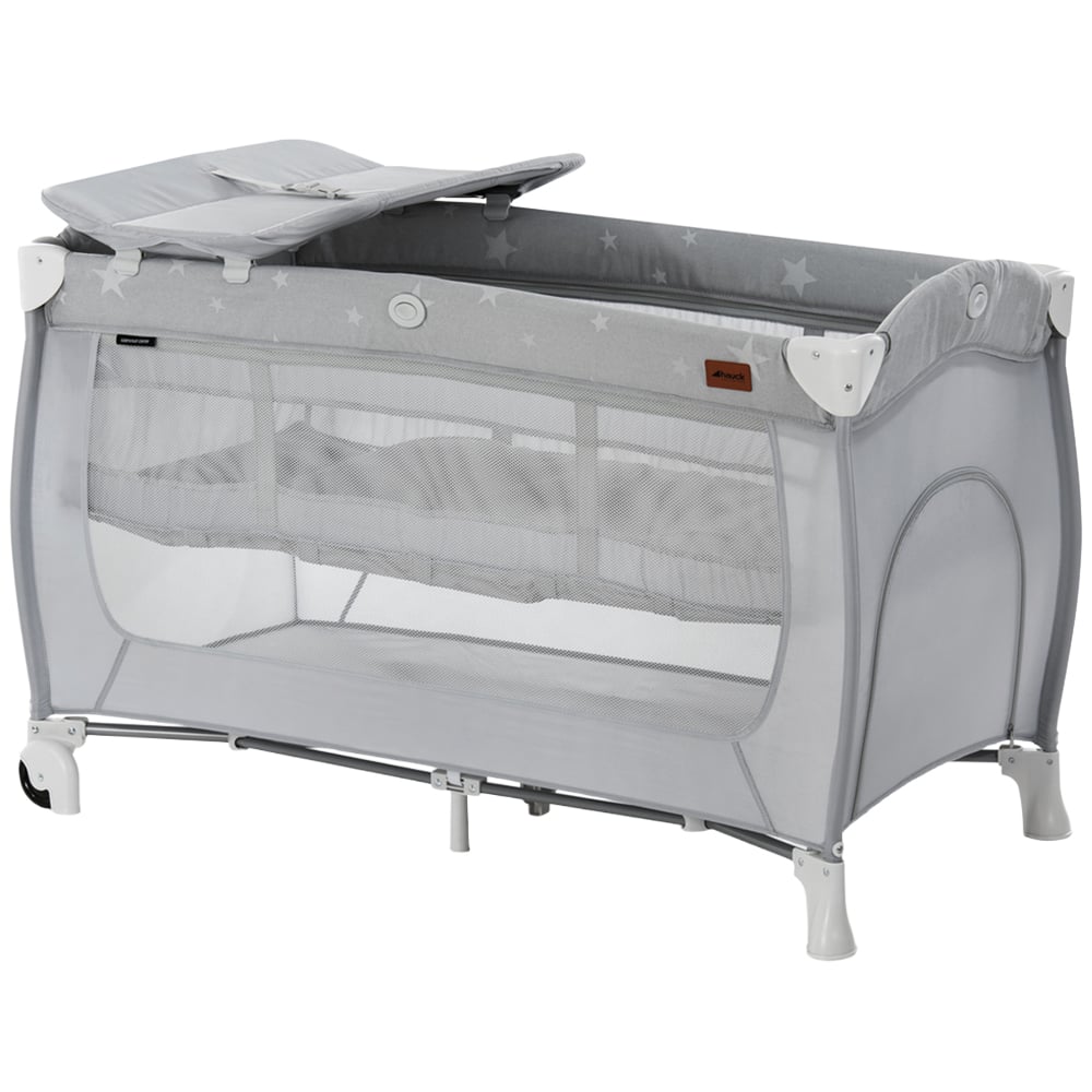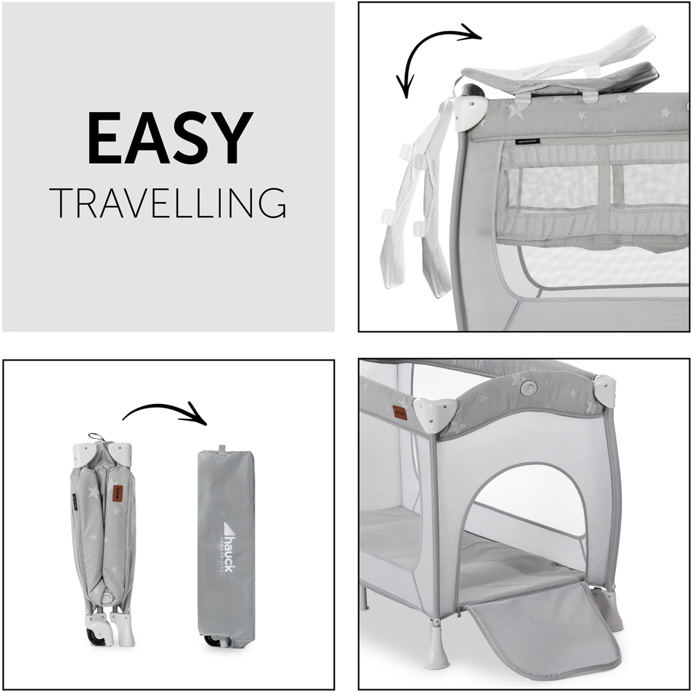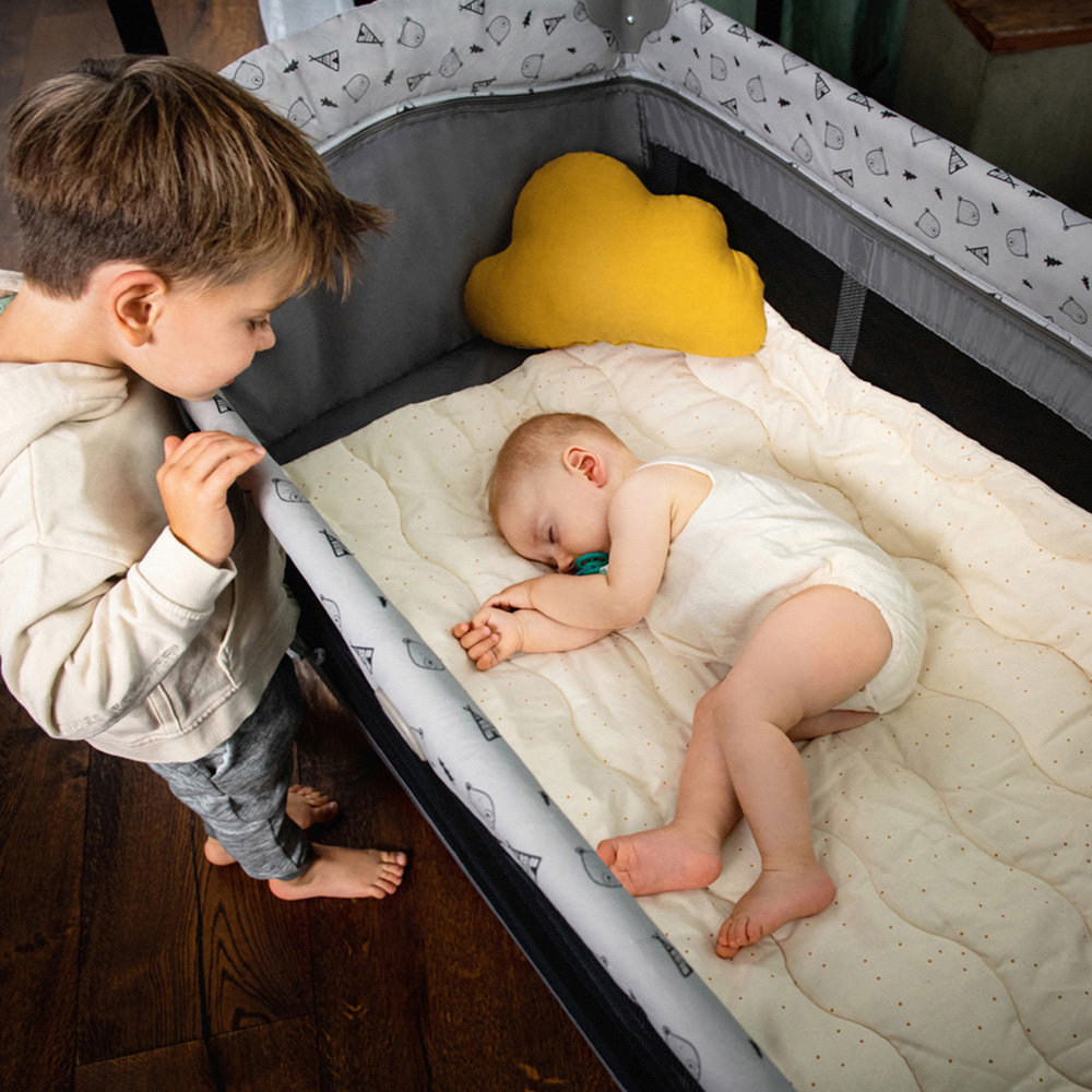 The Sleep N Play Centre travel cot comes with comprehensive accessories and can be used in four different ways. Your child can comfortably sleep and play, you can easily change your baby’s nappies and transport the folded cot wherever you wish, allowing maximum flexibility right from birth. A foldable base is already included. Thanks to the elevated newborn level, you can comfortably lay down your baby who can be easily reached during the night. On the included changing table with a safety belt, you can change your baby’s nappies and lay down your little one back in the cot. Later on, you can remove the level and the changing table. During the daytime, you can effortlessly relocate the bed thanks to the two integrated wheels and use it as a playpen. The side exit on the cot’s end, which can be opened from the outside only, offers your toddler entertainment. Your child can independently crawl out and back in again when wanting to relax. By pressing the buttons located in the middle of all four sides, the assembly and folding can be done in the blink of an eye. Folded up compactly, you can easily stow away the travel cot and accessories in the included carry bag.