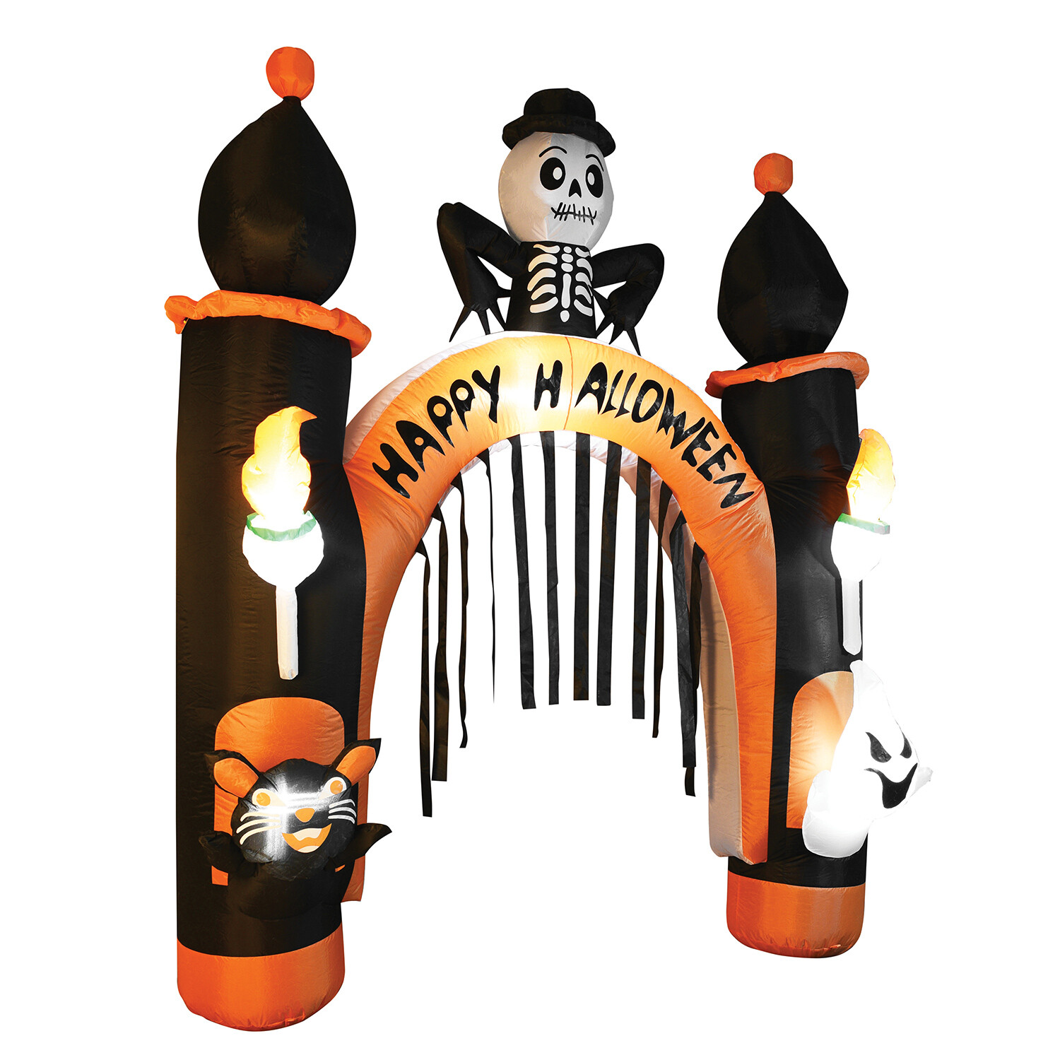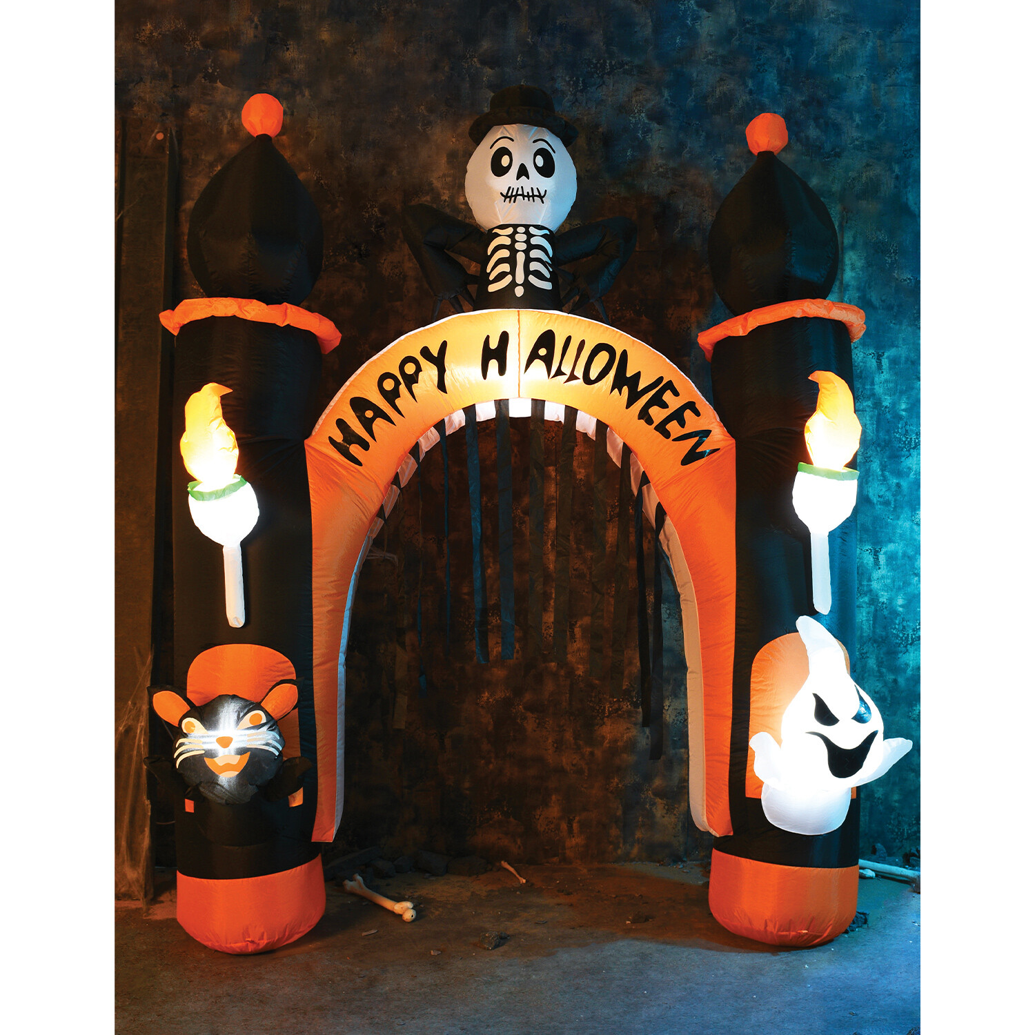 Transform your home into an eerie space with this Haunted Hallows Inflatable Arch. Perfect for adding a spooky touch to your outdoors, this inflatable arch will make a perfect addition to your Halloween parties. This decoration will attract trick or treats from near and far when you place it over your entranceway. Featuring a spooky skeleton, ghosts and other characters, it is sure to raise smiles and create fear. This light-up decoration inflates in minutes making setting it up a breeze. Moreover, you can effortlessly deflate it after use.