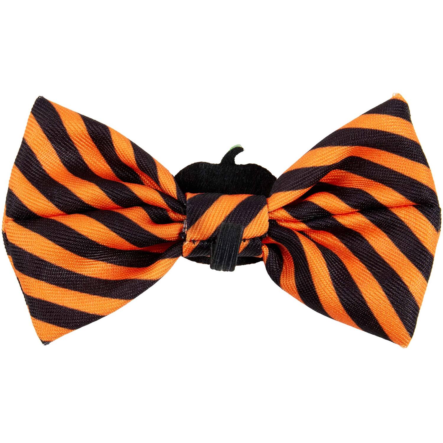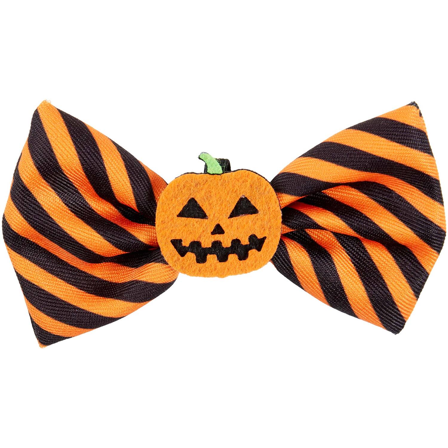 Make your adorable pooch ready for trick-or-treating with this Haunted Hallows Pumpkin Bowtie. It's easy to put on and features an elastic loop that allows you to attach it to your pet's collar. The bowtie showcases a cute pumpkin design that's perfect for giving your dog a spooky Halloween look.