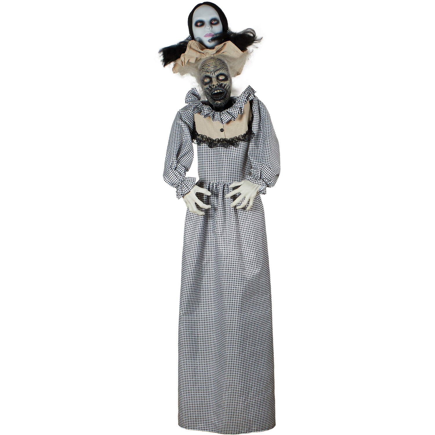 A truly terrifying addition to your home, this Animated Standing Lady is the perfect Halloween decoration. The scary lady has light-up eyes, her head pops up as if being removed from her body to reveal a second zombie face, and she makes eerie sounds to spook Halloween party guests and trick-or-treaters. The lady is highly detailed for an unnerving finish and is perfect for keeping near your front door so people get a fright as soon as they step into your haunted house, making it ideal for use year after year.