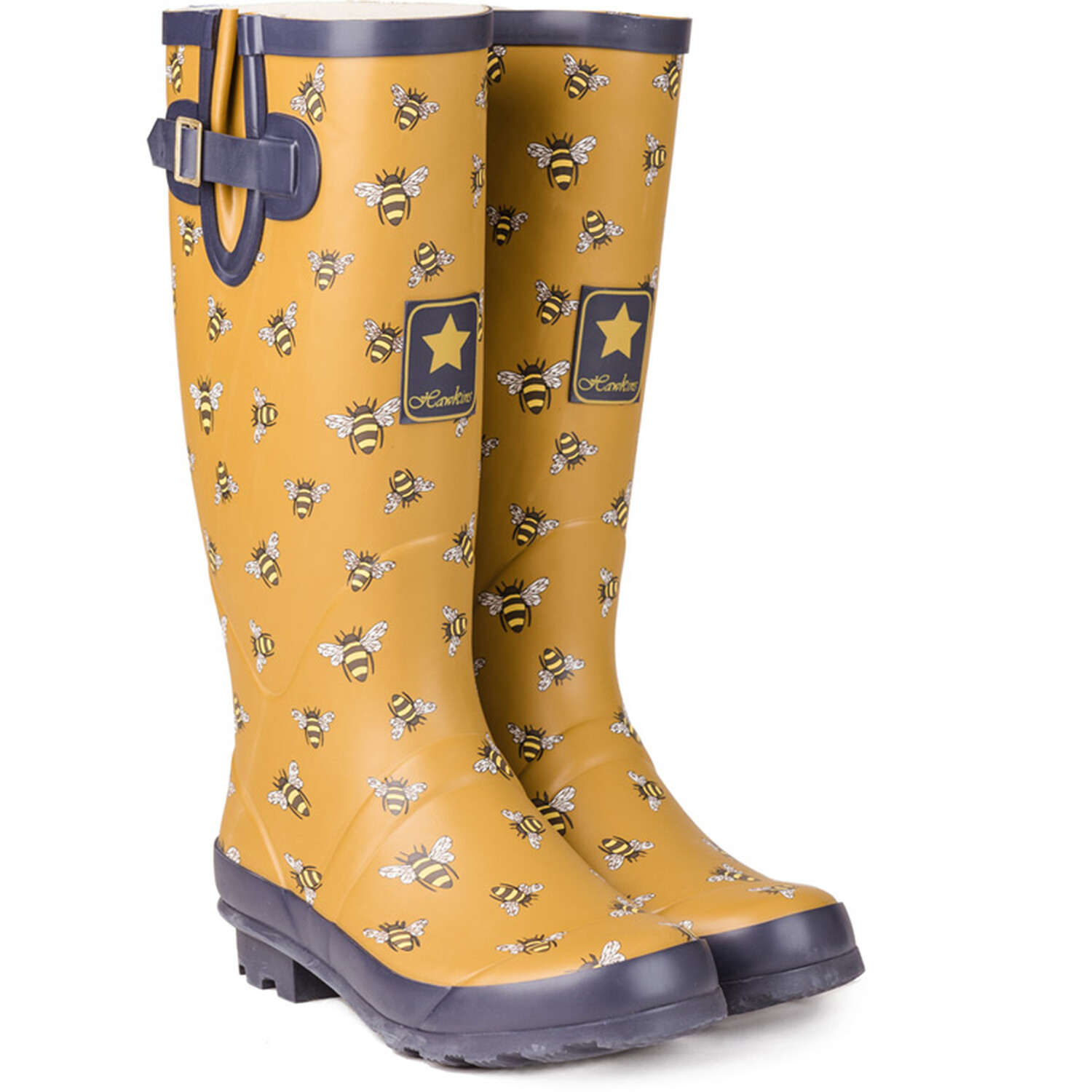 Practical and stylish, the Hawkins Women's Bee Wellington Boots will keep your feet dry and mud-free. With a fun bumble bee print, these rubber wellies feature an adjustable side leg gusset and strap detail for extra comfort.