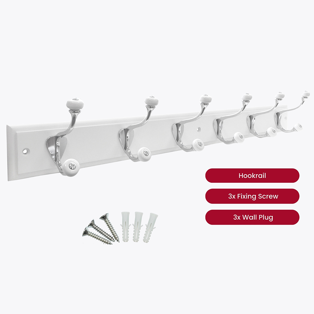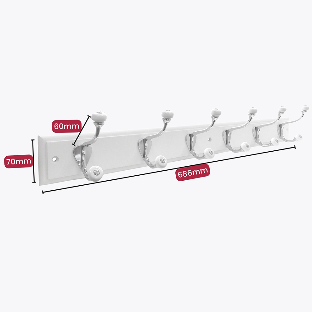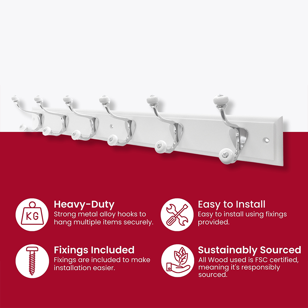 Elevate your organisation with this wall-mounted coat rack, featuring heavy-duty double-tiered metal hooks that can hold up to 3.4kg each. Ideal for hanging winter coats, bags, and more on the same hook without overcrowding. The board is crafted from eco-friendly wood sourced from well-managed forests, providing a sustainable storage solution. Perfect for various settings such as entryways, hallways, bedrooms, cloakrooms, and offices, this rack helps free up floor space by accommodating coats, hats, scarves, and umbrellas. It comes pre-assembled with screws and plugs for solid walls, with alternative fixings needed for plasterboard surfaces, ensuring a quick and hassle-free installation.