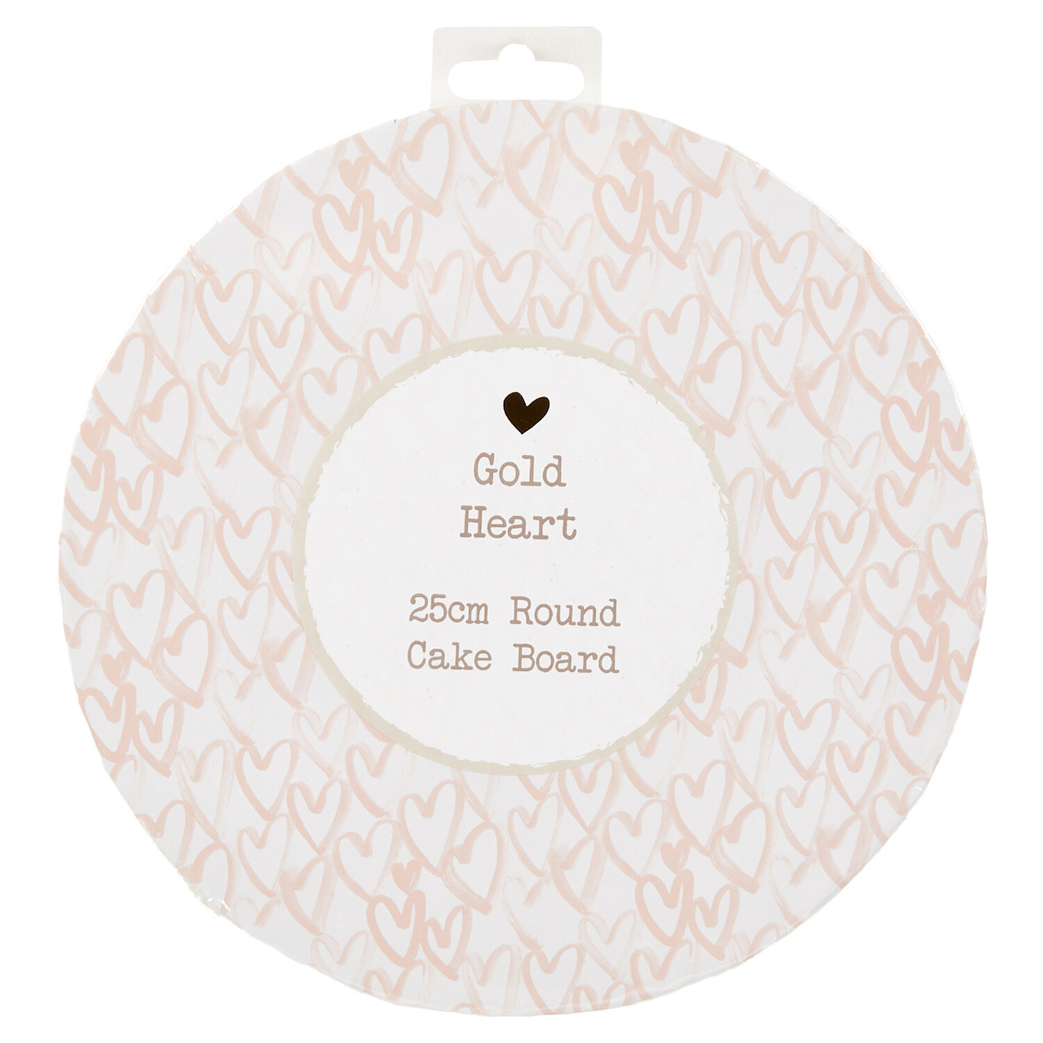 Showcase your cakes with the Hearts Round Cake Board. Made from a sturdy card, this attractive board features a lovely gold heart design, adding a touch of charm to any celebration. It is perfect for displaying your showstopping cakes at parties, weddings, or birthdays. Ideal for bake sales or gifting homemade treats, this cake board elevates any presentation.