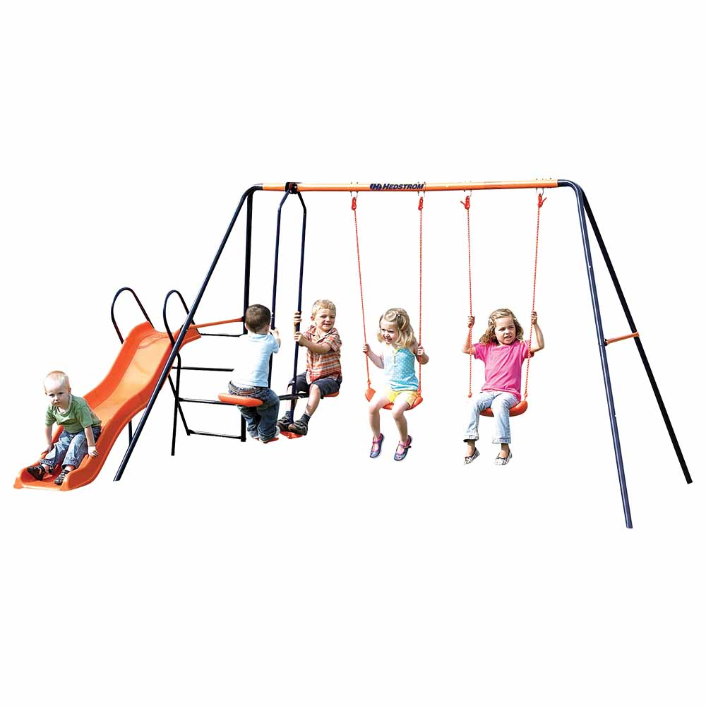 Get kids off the sofa and into the garden for active play with the Hedstrom Europa multi-play set with a slide, two swings and a glider! The single swings feature a blow-moulded seat for comfort as well as heavy-duty, soft-touch nylon straps which can be adjusted in height as children grow in size and confidence. The glider also has blow-moulded seats and foot-rests for extra stability and boasts a fast but smooth glide. The wavy slide measures 5.7ft in length and is again blow-moulded with steel support underneath for strong and stable construction and smooth slide action. The high handrails, broad stabiliser bars and grip tread to the top of the slide offer extra stability for getting seated. The set's mainframe is constructed from heavy-duty powder-coated steel for stability and durability and the entire set features UV resistance for longevity. With 3 activities on offer, the outdoor playset is perfect for entertaining up to four children at a time, making it ideal for school holidays, weekends or summer evenings! Note: For safety, the set must be secured into the ground using the ground anchors that are provided - we also strongly recommend securing via concreting. Recommended age: 3-10 years. Assembly required.