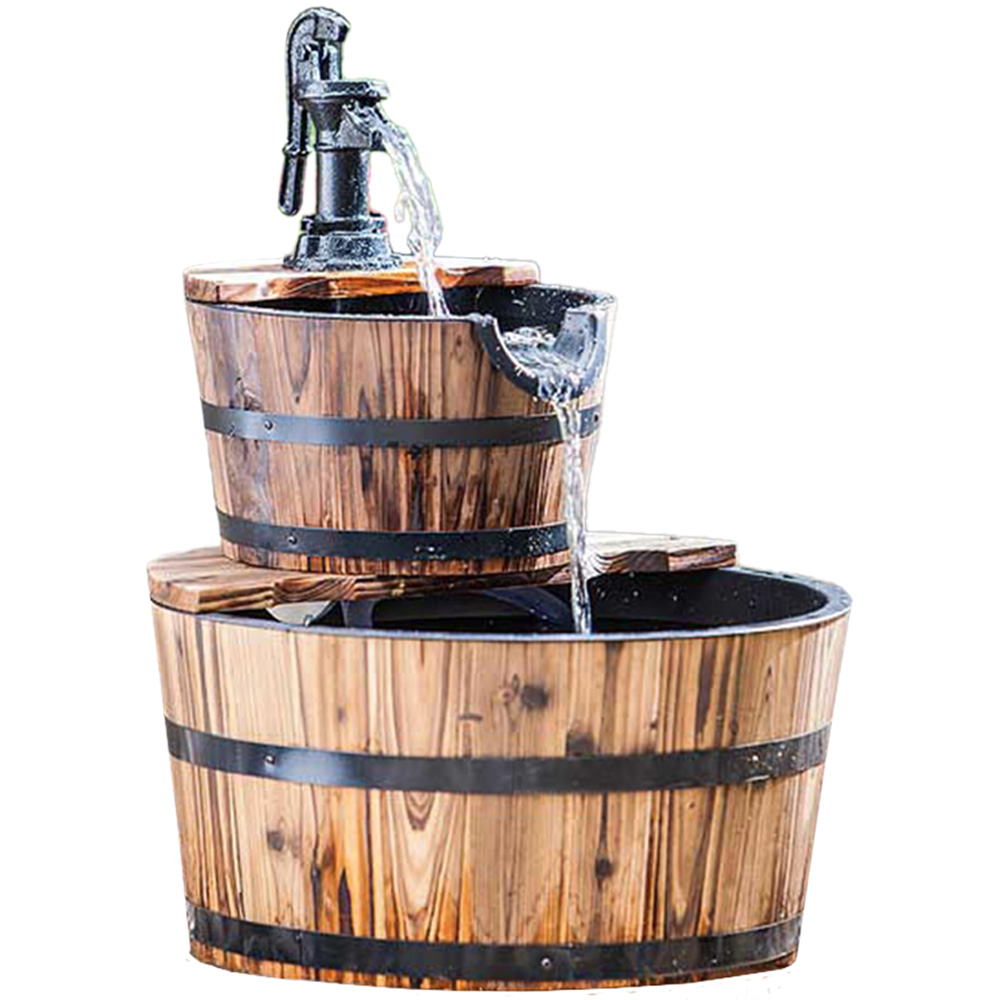 Make a fabulous addition to your space with the Heissner 2-Tier Wooden Barrel Water Feature. This real wooden barrel self-contained water feature boasts a hand pump that pumps water into the upper barrel gradually cascading it into the lower barrel. Stylish and classy, the real wooden barrels complement any place effortlessly. Also, easy to use, the water feature comes with a pump and a 5m cable for added convenience.