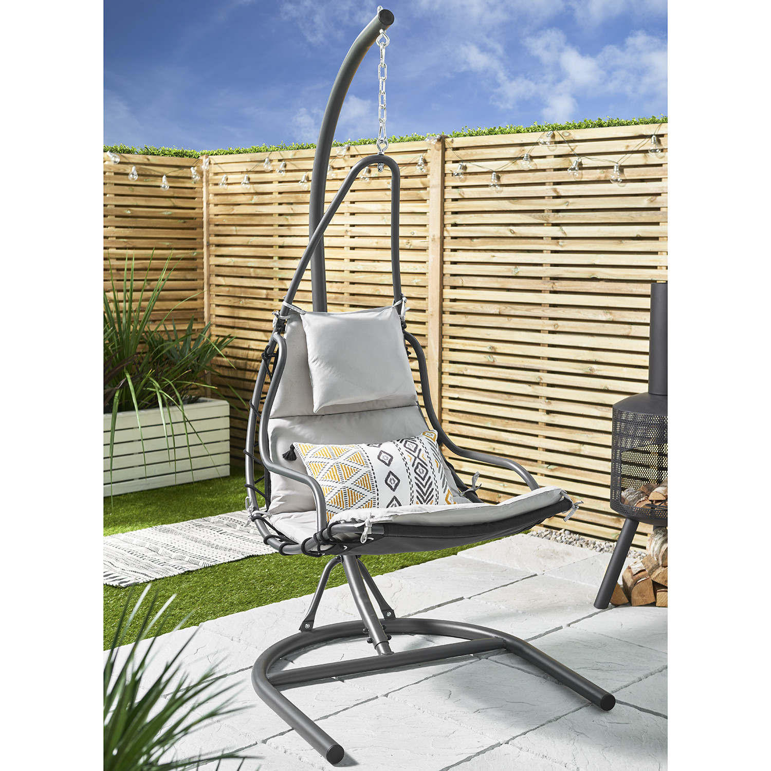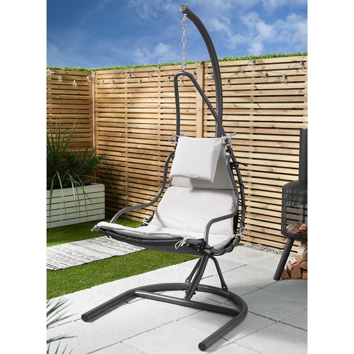 With its fun and unique design, the Helicopter Hanging Chair will soon become a firm favourite piece of patio furniture. The egg chair hangs from a tall, sturdy frame, connected by a chain which will bring a soothing swinging motion as you sit back and relax with a good book in the sun. Comfortable cushions, with extra padding in the head cushion, adds a high level of comfort, making the Helicopter Hanging Chair a perfect place to curl up and relax in the sun