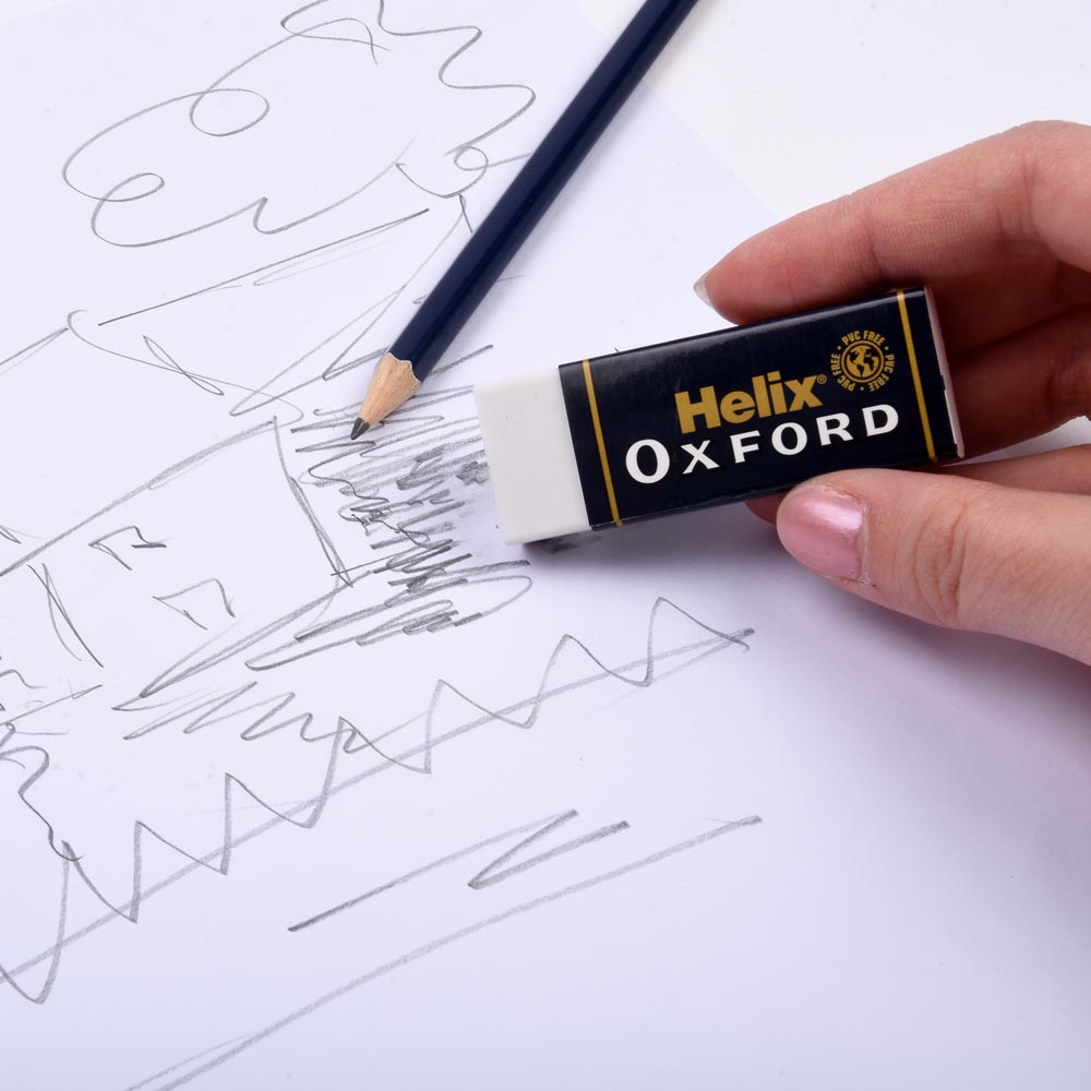 Tradition meets function with this Oxford range of twin pack erasers from Helix. Great for students at school and home, the premium quality erasers feature the traditional Oxford logo. The pack includes two large PVC, phthalate and latex-free erasers with a cardboard sleeve for protection. Each eraser measures: 64 x 21 x 12mm.