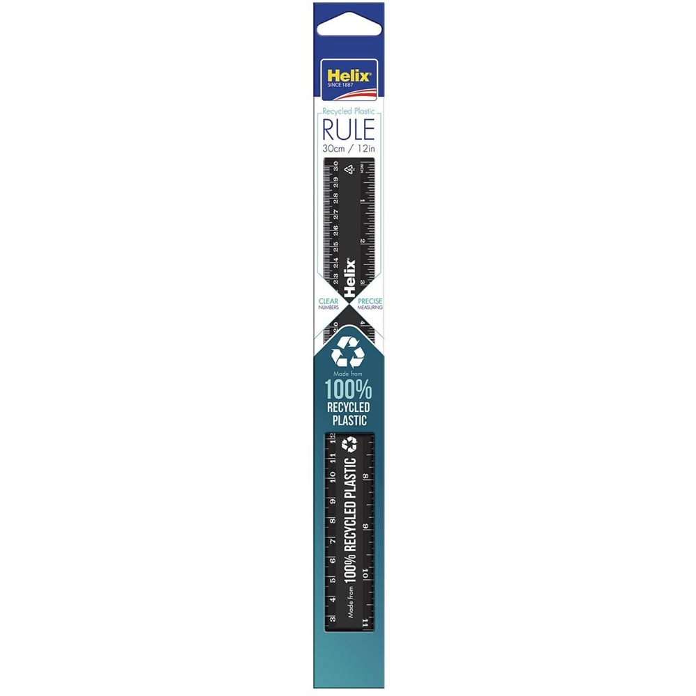 Made from 100% recycled plastic, this Helix Recycled Ruler 30cm is a school and household essential. With metric and imperial graduations, this black plastic ruler has white measurements for clear and visual reading. Excellent for helping you produce straight lines and measure small items.