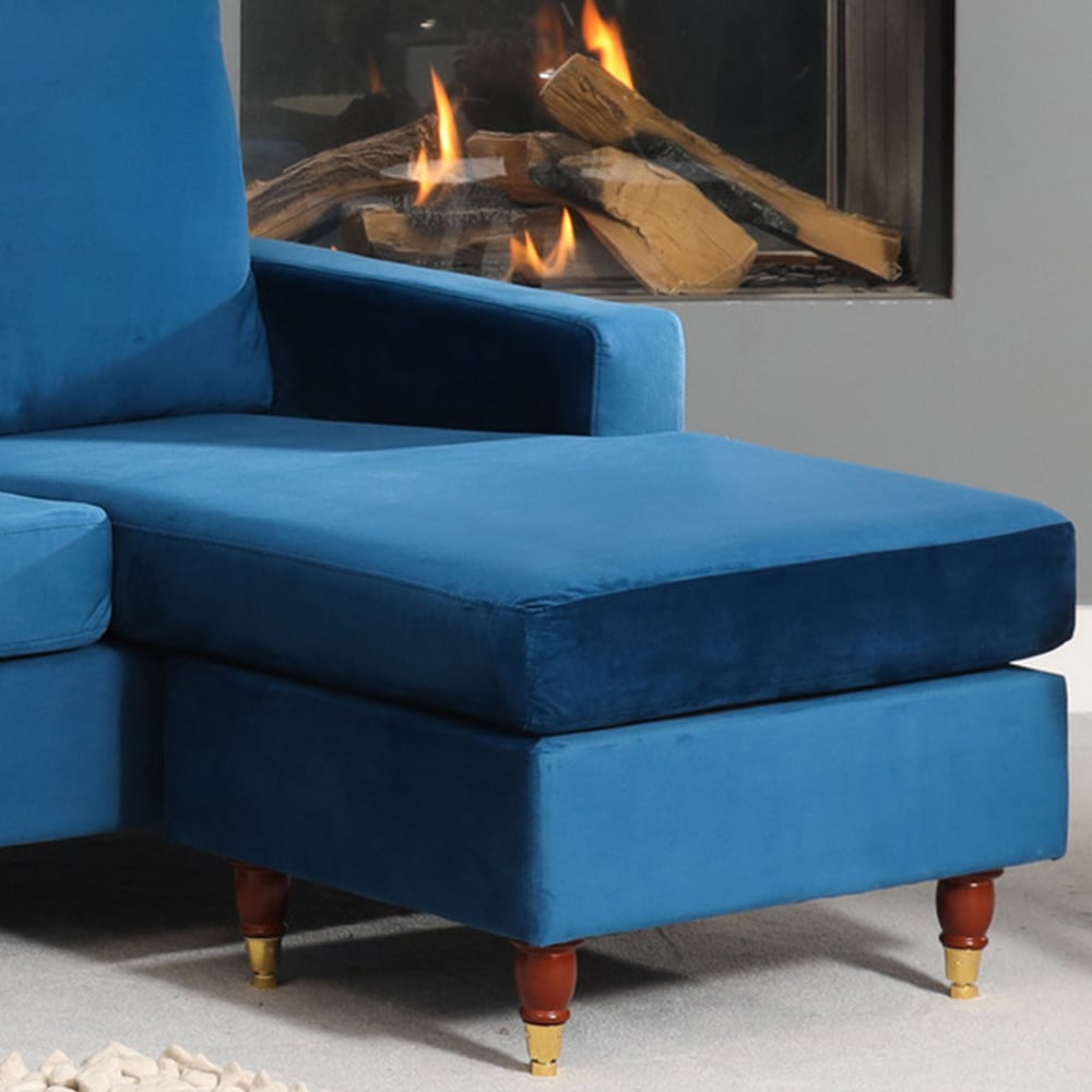 Bring flair and functionality to your home with this Hendrick 3 Seater Blue Reversible Corner Sofa. Crafted from solid hardwood, this chic sofa features a pocket-sprung interior that offers you superior support and comfort. With plump, blue fibre-wrapped foam cushions, this sofa gives you luxurious comfort for lounging and relaxing. Its dark wooden legs with brass-coloured wheel tips on the front add a touch of elegance to your living space. Sporting a compact design, this stylish sofa is an ideal choice for apartments or smaller living rooms. And for your convenience, this sofa is delivered and assembled by the two-man delivery team to provide a hassle-free experience from start to finish.