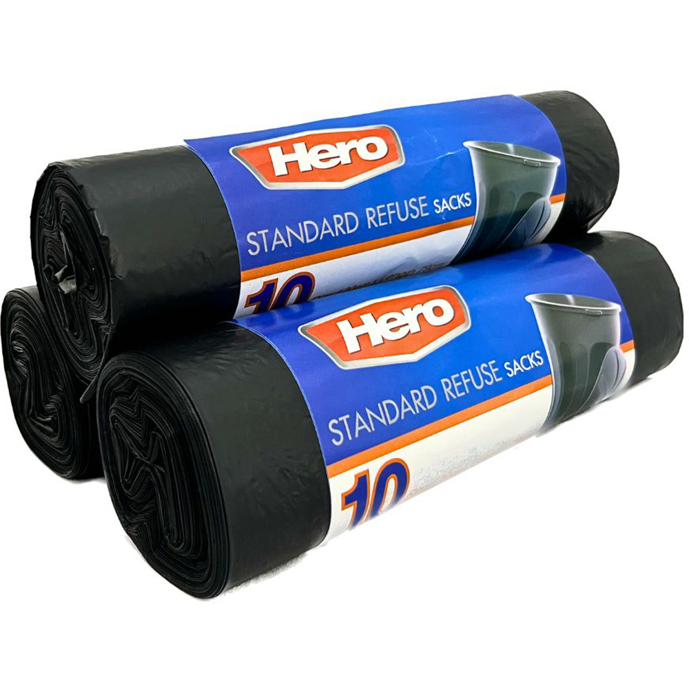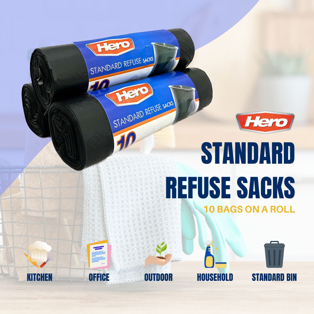 Keep your space clean and hygienic with Hero 50L Bin Bag Liners. These large, rectangular sacks are a practical solution for managing various types of waste, from food and paper to plastic and general refuse. The smooth finish and solid pattern in classic black complement any room or setting, ensuring that your bins remain stylish and functional. Crafted from durable polyethylene, these bin bags are designed for both indoor and outdoor use, making them perfect for a wide range of applications. Each bag has a capacity of 50 litres and measures 22 metres in length and 600mm in width, with a height of 790mm. Their flat top feature and eco-friendly attributes cater to your environmental concerns while providing a reliable waste disposal solution.