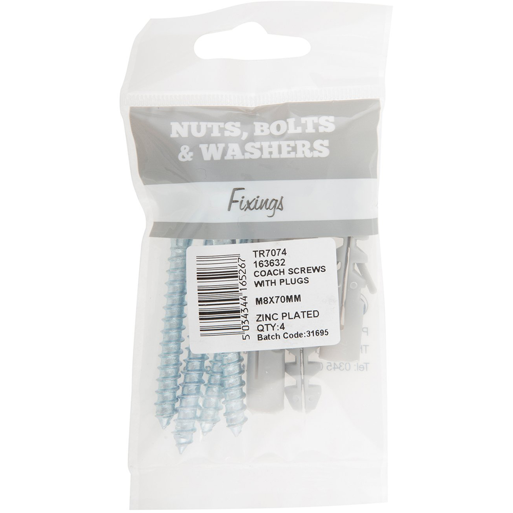 Hiatt M8 70mm Zinc Plated Coach Screws with Wall Plugs 4 Pack