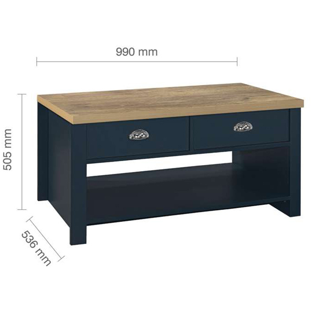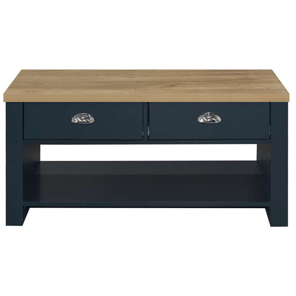 Add a classic touch to your home decor with the Highgate Two Drawer Coffee Table, inspired by timeless farmhouse furniture. The Highgate range has been designed to complement both modern and traditional homes. This elegant coffee table crafted in a navy and oak finish is suitable for most interior spaces. Featuring two drawers with silver cup handles and a large open shelf underneath, ideal for storing books and other items as well. This coffee table is an excellent combination of style and functionality. Care instructions: Wipe carefully with a soft, dry cloth.