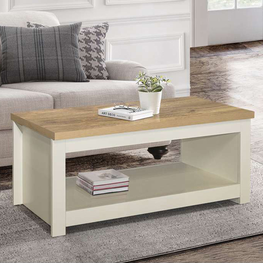 Add a classic touch to your home decor with the Highgate Coffee Table, inspired by timeless farmhouse furniture. The Highgate range has been designed to complement both modern and traditional homes. This elegant coffee table crafted in a cream and oak finish is suitable for most interior spaces. Featuring a smooth top and a large open shelf underneath, ideal for storing books and other items as well. This sturdy coffee table is an excellent combination of style and functionality. Care instructions: Wipe carefully with a soft, dry cloth.