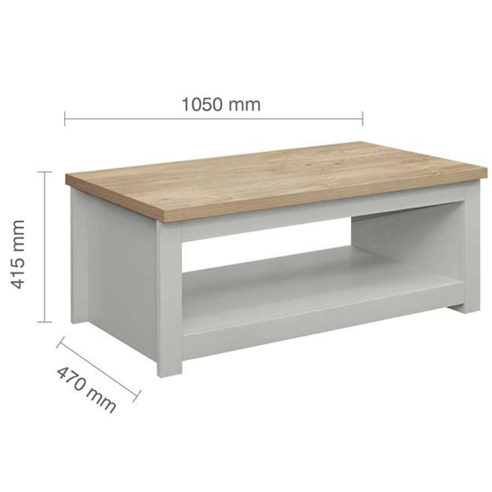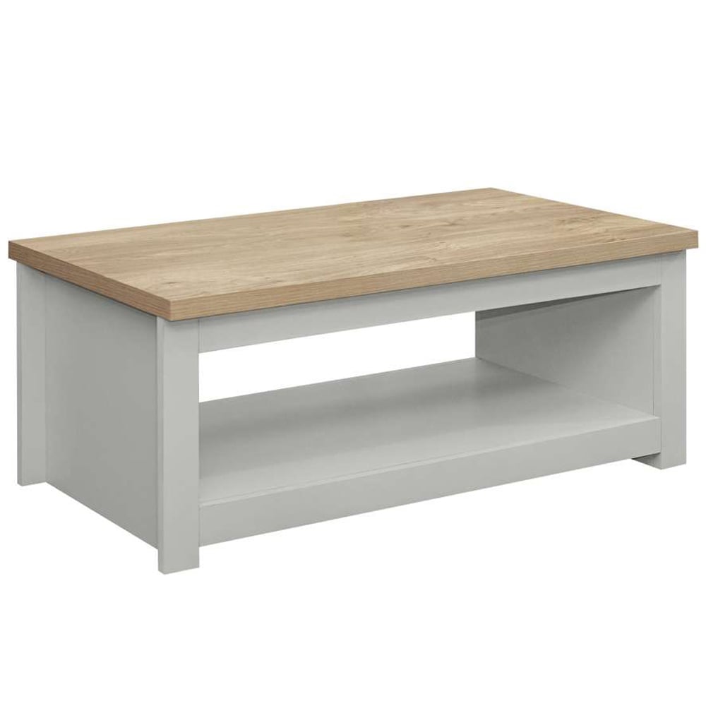 Add a classic touch to your home decor with the Highgate Coffee Table, inspired by timeless farmhouse furniture. The Highgate range has been designed to complement both modern and traditional homes. This elegant coffee table crafted in a grey and oak finish is suitable for most interior spaces. Featuring a smooth top and a large open shelf underneath, ideal for storing books and other items as well. This sturdy coffee table is an excellent combination of style and functionality. Care instructions: Wipe carefully with a soft, dry cloth.