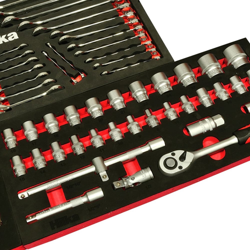 This EVA tool kit bundle, includes EVA 32 piece 1/2 inch Drive Socket Set, 75 piece 1/4 inch Drive EVA Socket Set Metric, 21 piece Spanner Set and 22 piece EVA Screwdriver Set. The sockets feature chrome vanadium steel fully heat-treated with a satin chrome finish for durability. Wall drive sockets give more torque and avoid damage to the nut with a quick-release soft grip 72 teeth ratchet. The spanner features fully polished chrome vanadium steel spanners tempered and hardened for durability. Precision machined 12-point combination end with a 15-degree offset for use in awkward positions.