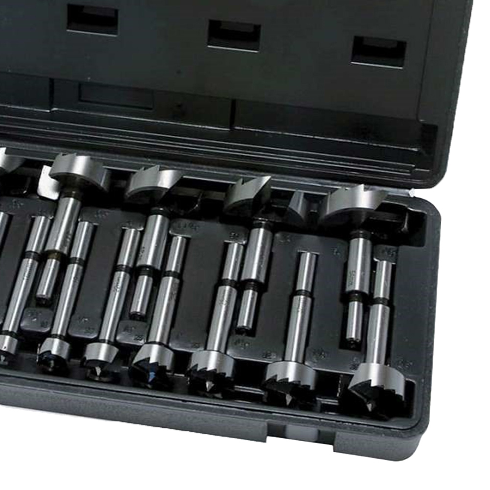 Forstner 16-piece bit set by Hilka contains hardened and tempered high-quality alloy steel bits. Precision machined cutting tips for a fast and effortless cut. The bit set is designed to make professional and clean flat holes in wood. In blow mould case for safe storage. Sizes: 1/4" (6mm), 3/8" (10mm), 1/2" (13mm), 5/8" (16mm), 3/4" (19mm), 7/8" (22mm), 1" (25mm), 1 1/8" (28mm), 1 1/4 (32mm), 1 3/8" (35mm), 1 1/2" (38mm), 1 5/8" (41mm), 1 3/4" (44mm), 1 7/8" (48mm), 2" (51mm), 2 1/8" (54mm). Also, a 6-10mm shank is supplied in a plastic carrying case.