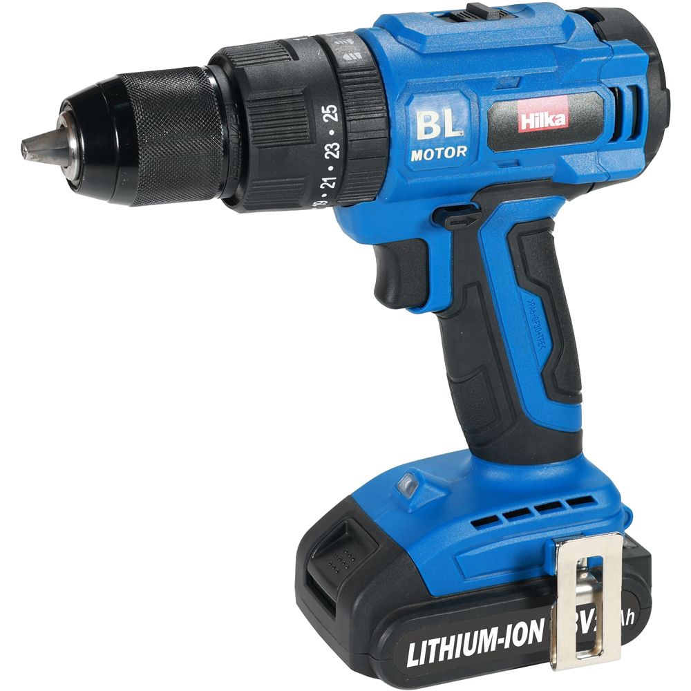 Experience the power of precision with the Hilka 18V Brushless Combi Drill with 2 x 2.0Ah Battery and Accessories. Experience improved efficiency, reduced maintenance, and less heat and noise with the latest brushless motor technology. The quick charger takes only 70 minutes to charge the 2.0Ah battery, and the set includes 50 accessories suitable for various tasks. This power tool features a 13mm metal keyless locking chuck, offering three functions, drill, hammer, and screwdriver, along with 25 torque settings and a two speed gearbox. The ergonomic design, soft grip handle, belt clip, and LED work light provide you with a comfortable and convenient user experience. With a wide range of accessories and specifications including DC 18 Volts, AC/DC adaptor, and a no-load speed of 0-500/0-2000 rpm, this combi drill is the ultimate tool for all your drilling needs. Plus, with an impact rate of 0-8000/0-32000 bpm, it's designed to tackle even the toughest jobs with ease.