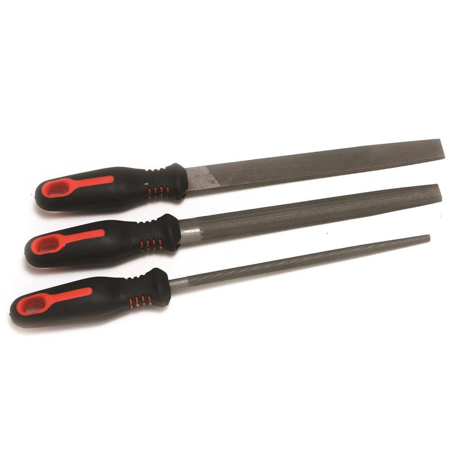 Get consistent, smooth results with the Hilka 3 Piece Engineers File Set. Crafted for precision and durability, this set is designed to meet the demands of any professional and DIY enthusiast. Each file is made from sturdy steel, offering optimal performance for shaping, smoothing and cutting wood, metal and plastic. The set includes flat, half-round, and round files, providing versatility for various applications. The ergonomic two-component soft grip handles ensure comfortable handling and better control during extended use. All files are double-sided for extended life and feature integral hanging holes for convenient storage.