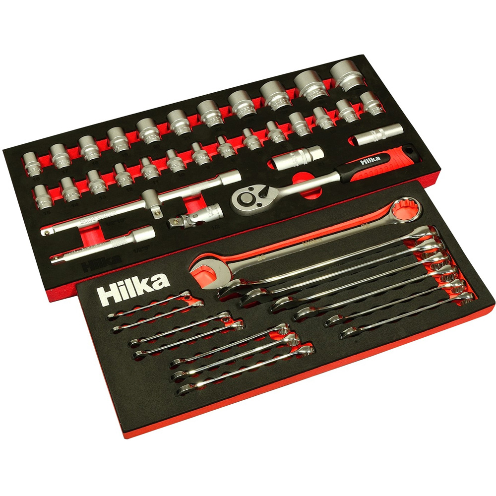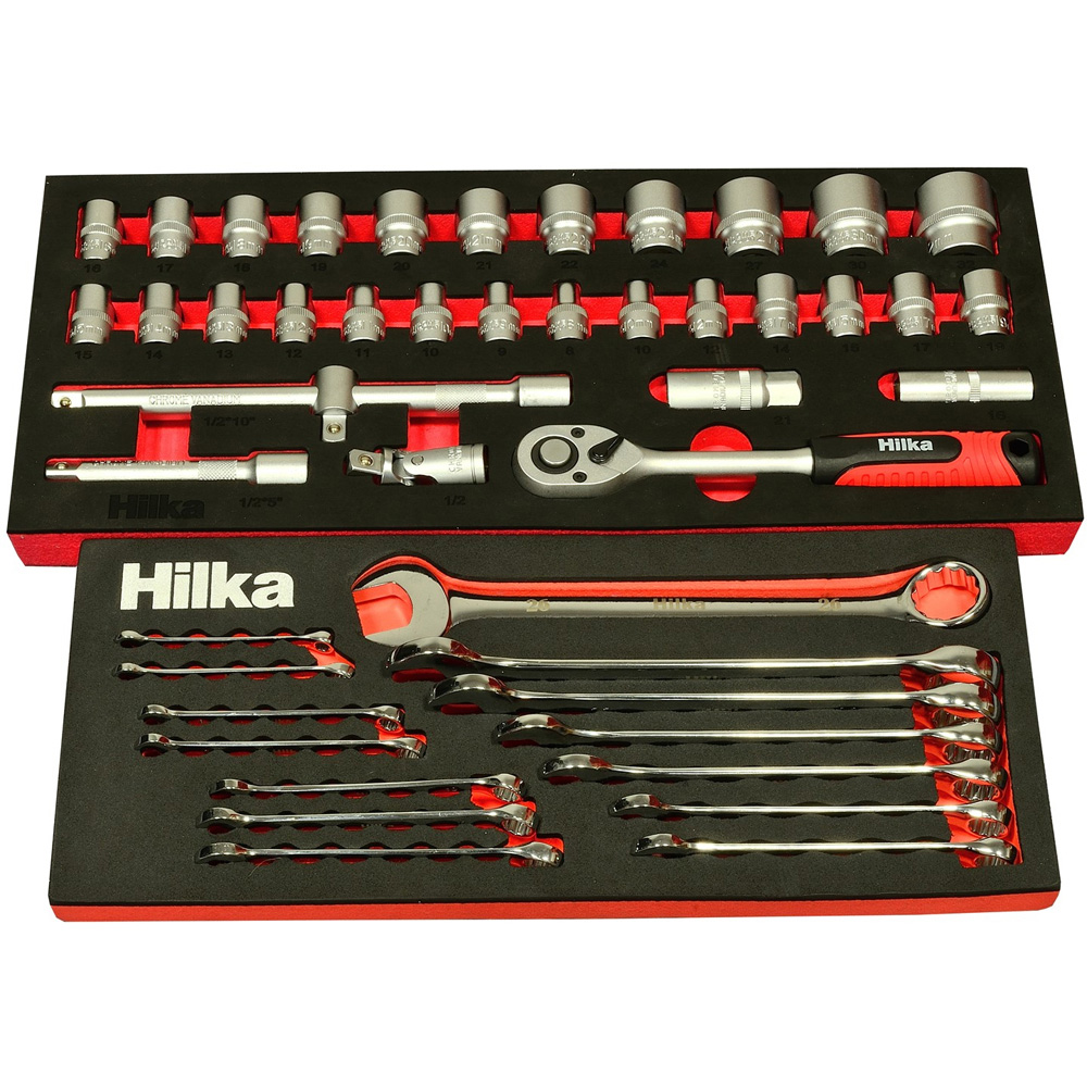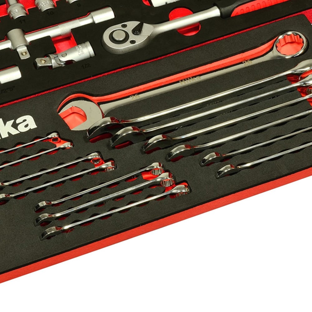 This EVA tool kit bundle includes EVA 32 piece 1/2 inch Drive Socket Set and 14-piece Spanner Set. The sockets feature chrome vanadium steel fully heat-treated with a satin chrome finish for durability. Wall drive sockets give more torque and avoid damage to the nut with a quick-release soft grip 72 teeth ratchet.  The spanner features fully polished chrome vanadium steel spanners tempered and hardened for durability.