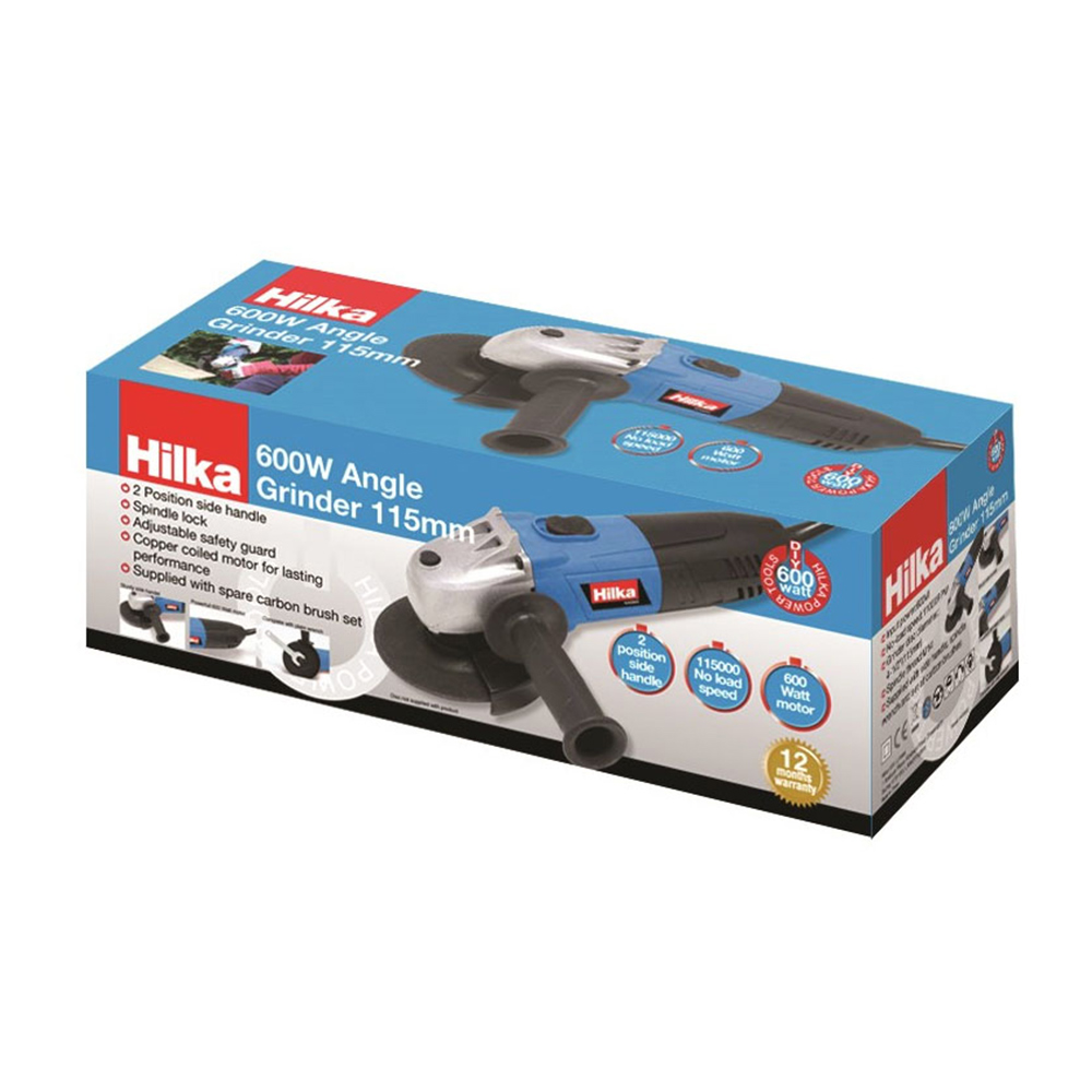 The powerful Hilka 4.5inch 600w Angle Grinder is suitable for a wide variety of tasks. It features a copper-coiled motor for lasting performance and is supplied with a spare carbon brush set, front handle and depth gauge. It has a two-position side handle, spindle lock and adjustable safety guard for added convenience. No-load speed: 0-11,000rpm. Spindle thread: M14.
