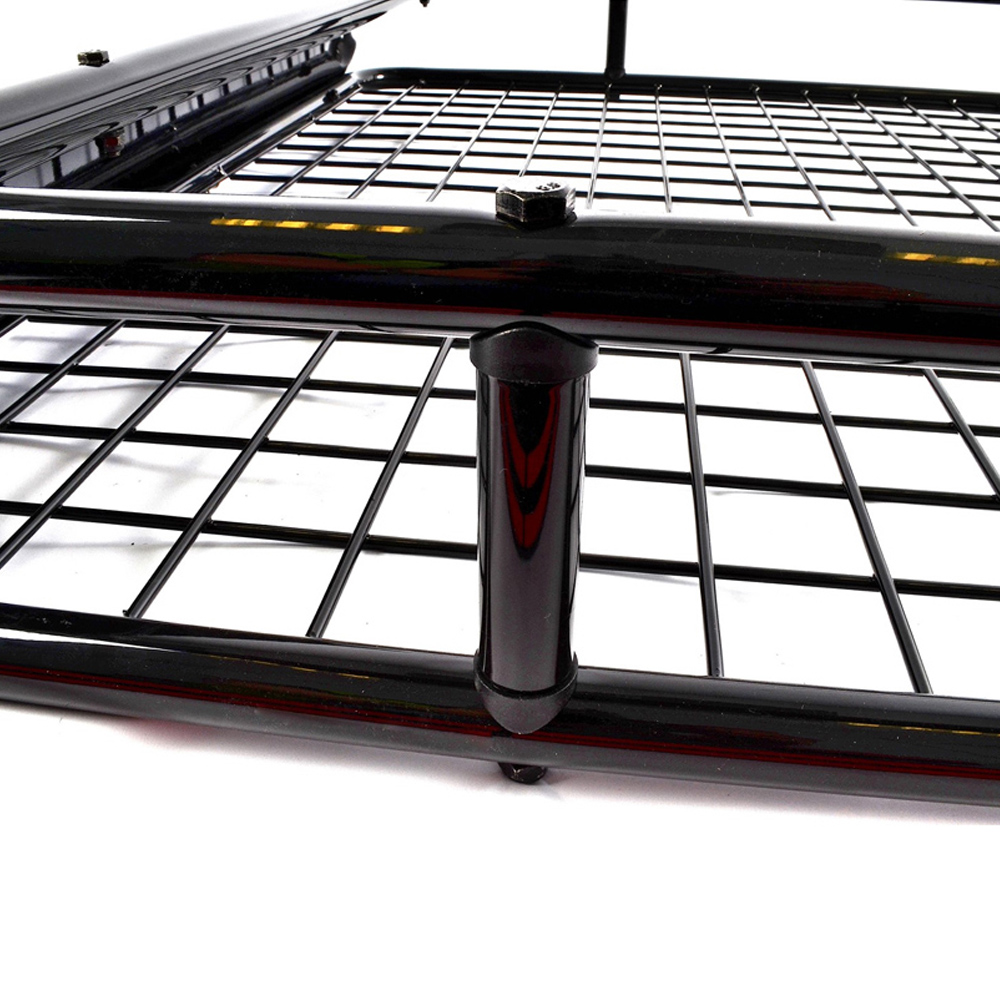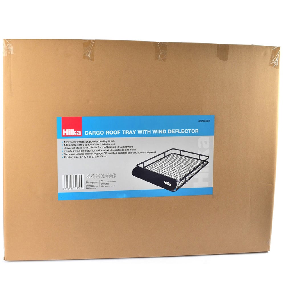 Maximise your vehicle’s storage potential with the Hilka Cargo Roof Tray with Wind Deflector. Constructed from sturdy alloy steel with a black powder coating finish, this tray is built to withstand the elements and provide long-lasting performance. Designed to be universally compatible, it fits roof bars up to 9.3cm wide using sturdy U-bolts, ensuring a secure attachment on most vehicles. With dimensions of 15 x 97 x 120cm, the tray offers ample space for your luggage, DIY supplies, camping gear and sports equipment. It also features an integrated wind deflector that reduces wind resistance and noise. It has a maximum carrying capacity of 65kg, making it perfect for all your adventure needs.