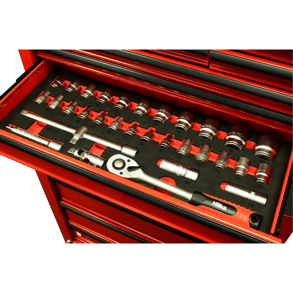 Enhance your tool collection with the Hilka Tools 32 Piece 1/2" Drive EVA Socket Set Metric, designed for durability and efficiency. Crafted from chrome vanadium steel and treated with a satin chrome finish, this set ensures long-lasting resilience. The wall drive sockets are engineered to provide increased torque while protecting the nut from damage. For convenience and a secure fit, the set includes a quick-release soft grip 72 teeth ratchet equipped with a spring-loaded ball bearing. All components are neatly organized in an EVA foam tray, making storage and accessibility straightforward. - EVA foam tray dimensions: 50.8 x 22.1 x 3.2cm