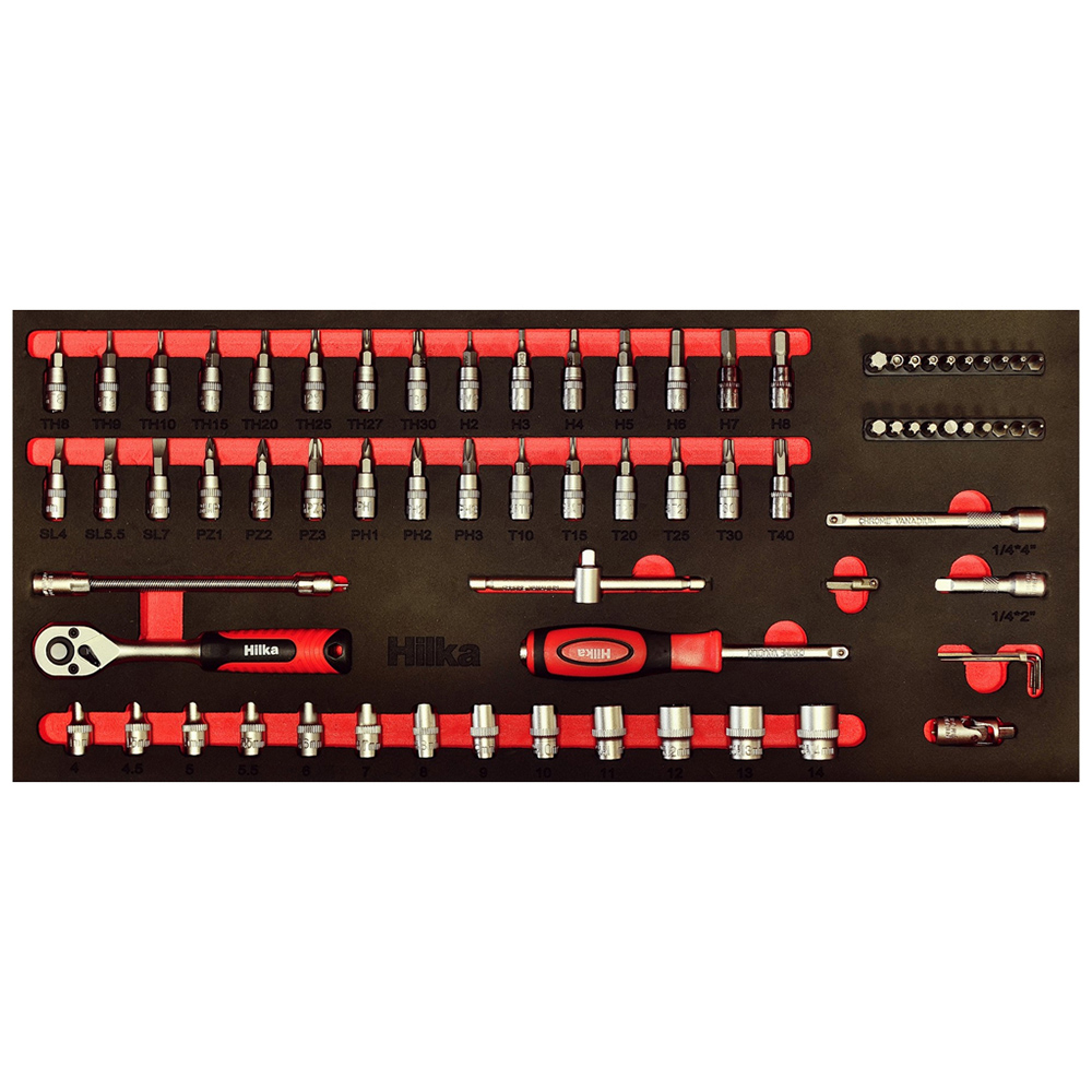 Explore the robust craftsmanship of Hilka Tools' 75 piece 1/4 inch Drive EVA Socket Set Metric, designed to enhance your mechanical prowess with its durable chrome vanadium steel construction and satin chrome finish. This comprehensive set boasts wall drive sockets that maximise torque and minimise nut damage, alongside a quick-release, soft-grip 72 teeth ratchet that ensures secure socket fitment with its spring-loaded ball bearing mechanism. Safely housed in an EVA foam tray, this set includes a variety of sockets, bit sockets, bits, and additional tools, making it an indispensable kit for any mechanic. EVA foam tray dimensions: 50.8 x 22.1 x 3.2cm.