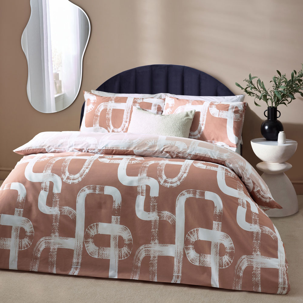 Enjoy a comfortable sleep with the Hoem Tuba King Size Plaster Duvet Set. It features an abstract printed design of arching brushstrokes, set on a contrast, earthy clay pink background inspired by setting plaster tones. Featuring a lighter alternative toned print on the reverse for a more neutral look. OEKO-TEX certifies this product, showing it has been sustainably made. Quick drying with minimal ironing required, the set includes two pillowcases. With its reversible design and button fastening, it can go with any interior space.