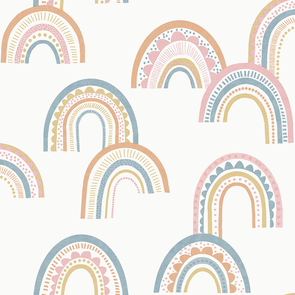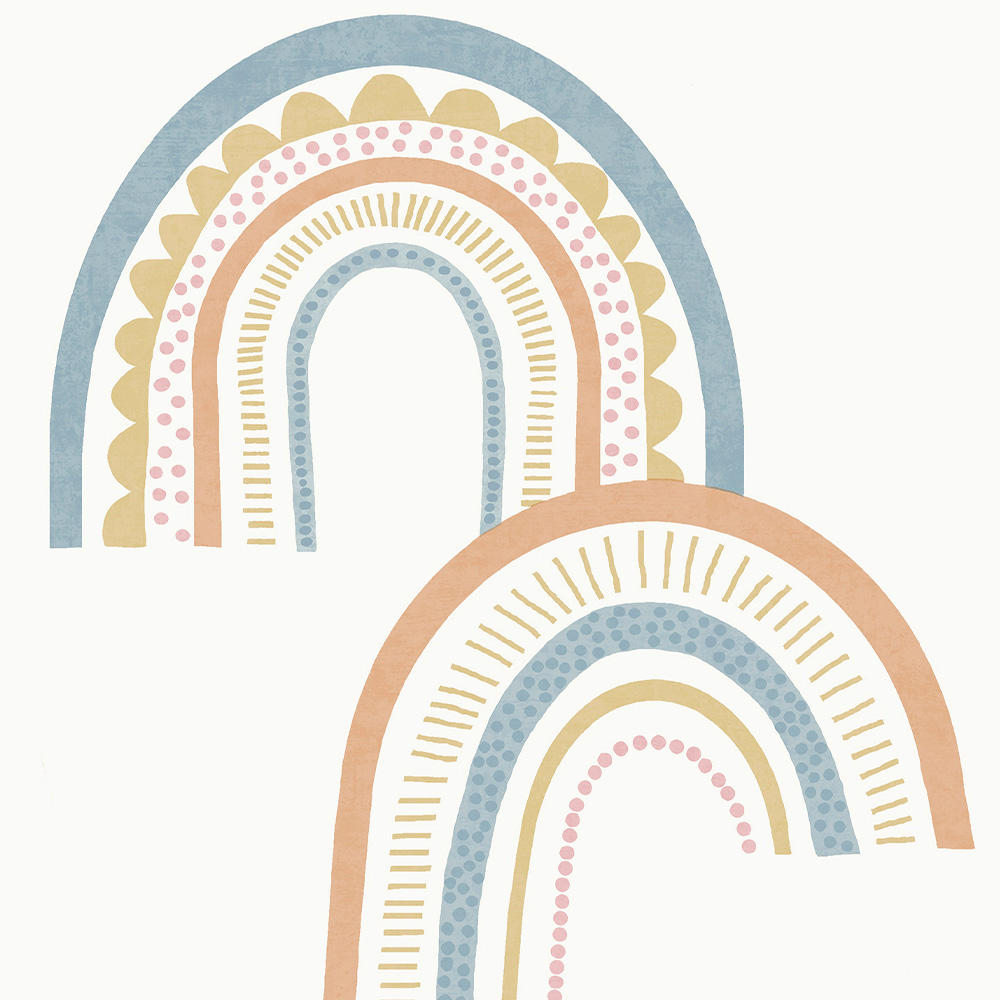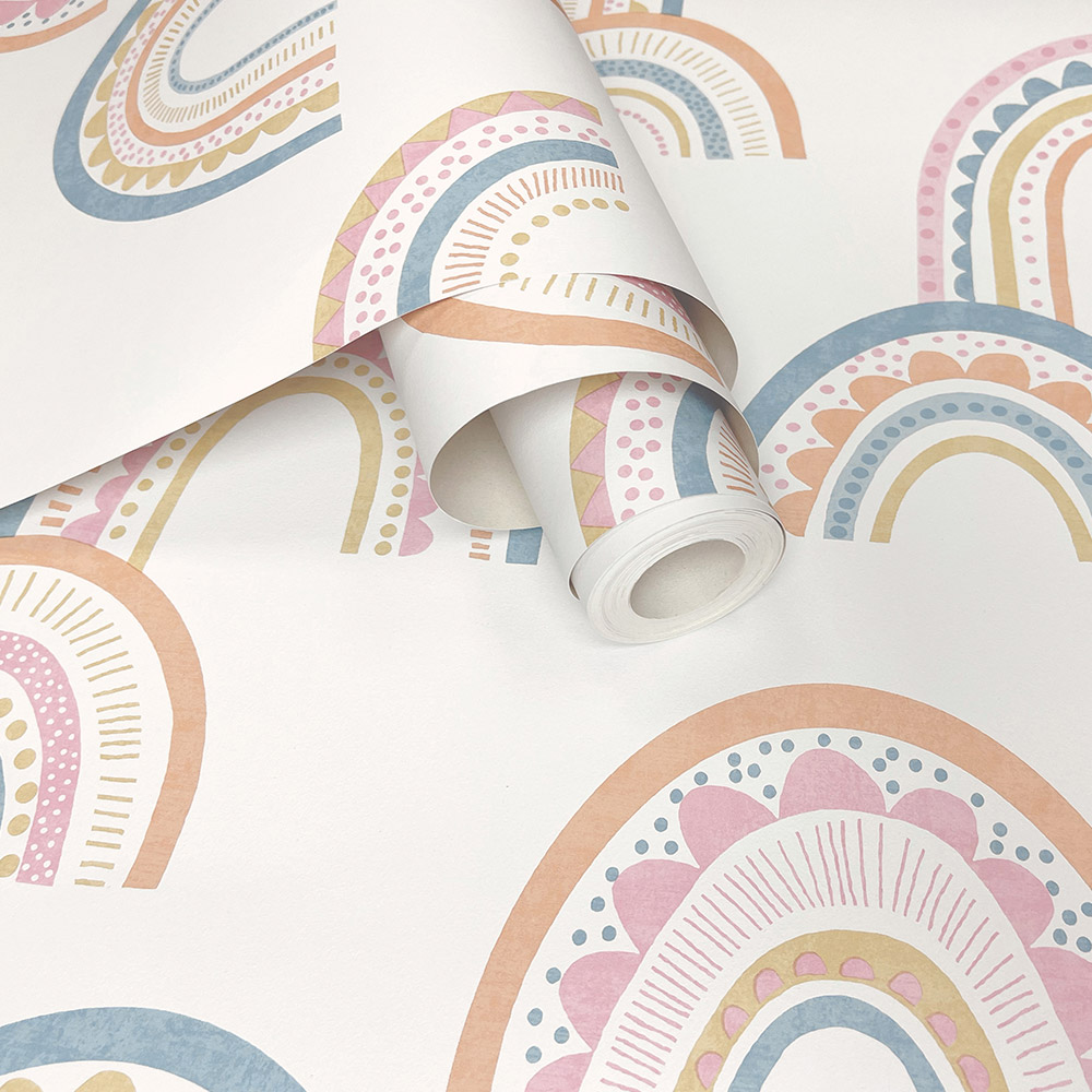 Make a fresh addition to your home decor with Holden Decor Boho Rainbow Wallpaper. Perfect for any child's bedroom - this quality FSC-certified wallpaper features multi-coloured rainbow arches made up of interesting patterns such as scallops, spots and stripes. This wallpaper with a matt finish is smooth and spongeable. Application: Paste the paper. Roll length 10.05m. Roll Width 53cm. Design Match: Offset. Design Repeat: 53cm/26.5cm. Colour: Orange/Pink/Blue.