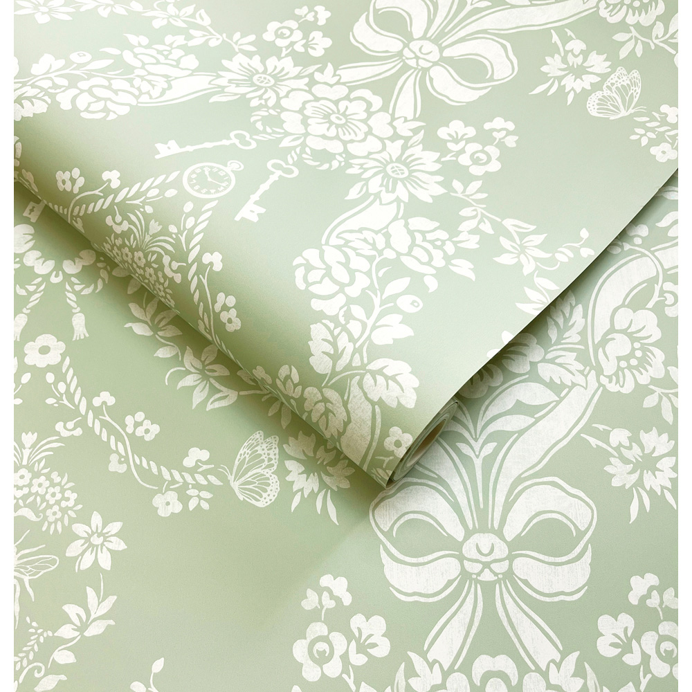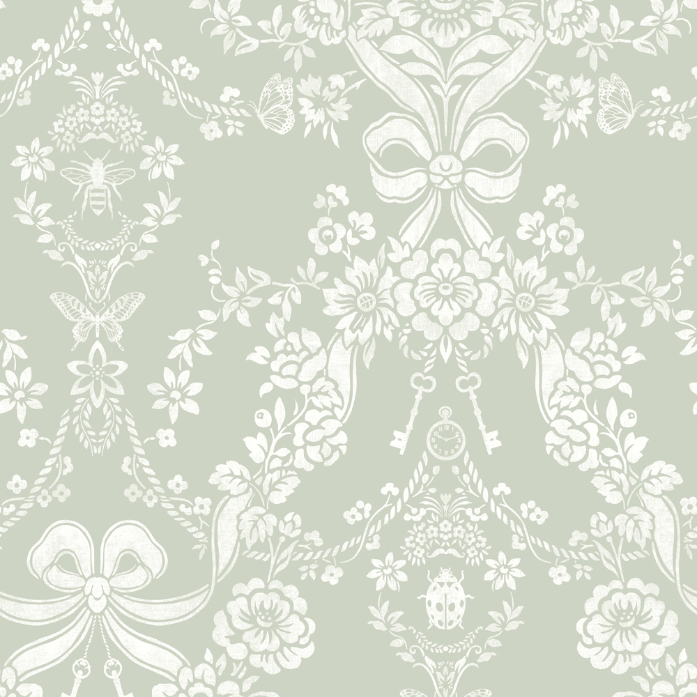 A graceful bow damask design featuring flowers, bees, ladybirds, and bows, woven into an elegant, repeating pattern. The delicate motifs add a touch of nature’s charm while maintaining the timeless sophistication of the damask style.