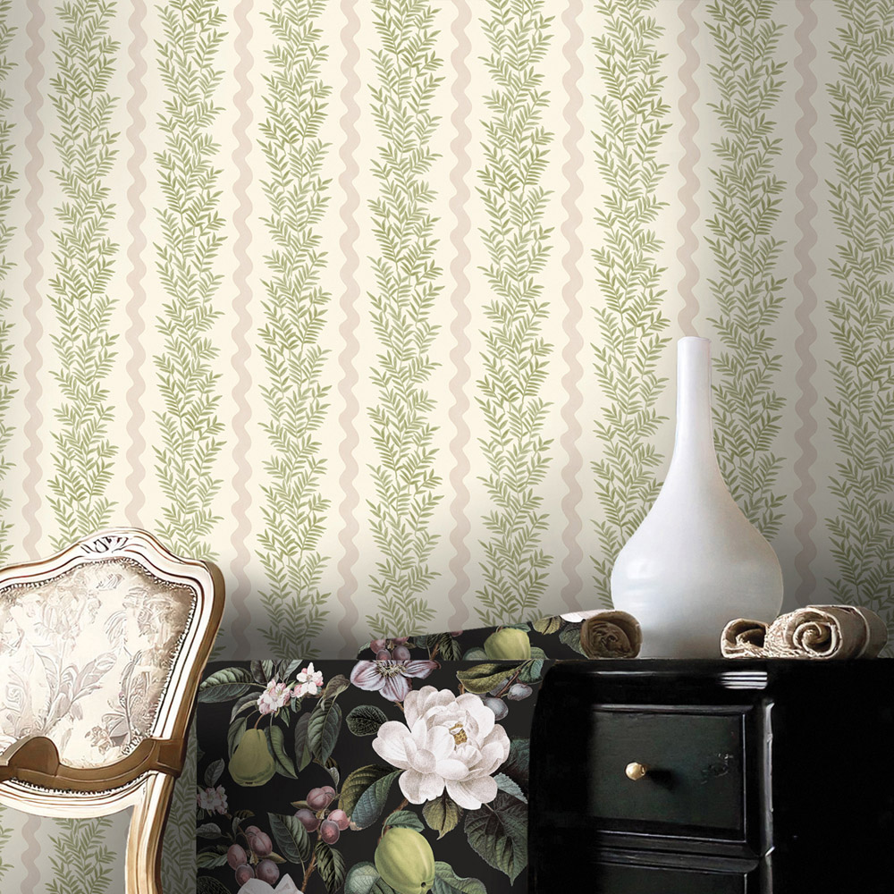 This modern take on a simple stripe features tonal leaves framed by a vertical structured wave. Quality 150gsm paper substrate. This wallcovering is washable. Printed using FSC-certified substrate.