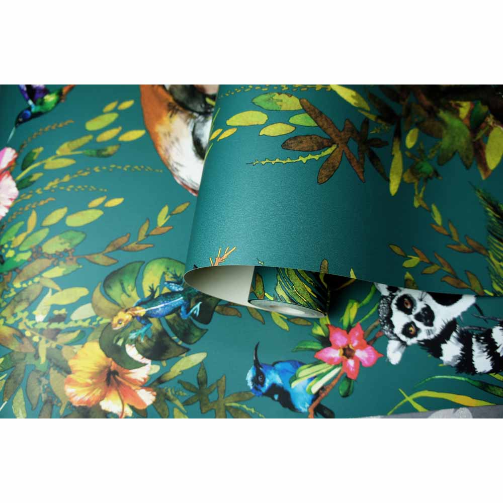 This quirky Lemur Wallpaper features a collection of detailed illustrated style lemurs with colourful hummingbirds and tropical flowers in beautiful vibrant colours on a bold teal background. Paste the Paper. Design Match: Straight, Design Repeat: 53cm, Roll Length: 10.05m, Roll Width: 53cm