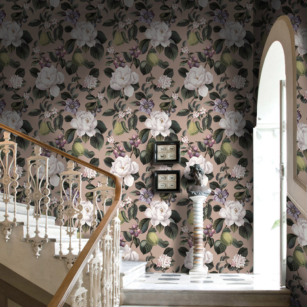 A design featuring pears and blossoms that sit on a range of a bold matt background. Quality 150gsm paper substrate. This wallcovering is washable. Printed using FSC-certified substrate.