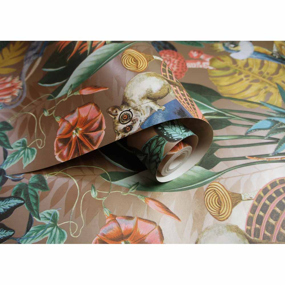 Give a fresh feel and modern look to your interior spaces with the quirky and fun tropical design of Wonderland wallpaper. It features parrots wearing a crown, chameleons with a top hat and bush babies wearing a monocle! All are set within bold tropical leaves with a metallic gold background. The matt printed wallpaper will suit naturally with your selected space and make them look good. Ideal to suit most interior decor styles, the wallpaper is perfect for creating a decadent feel in any room. Application: Paste the paper. Design match: Straight match. Design repeat: 53cm. Roll: length 10.05m, width 53cm. Colour: Gold.