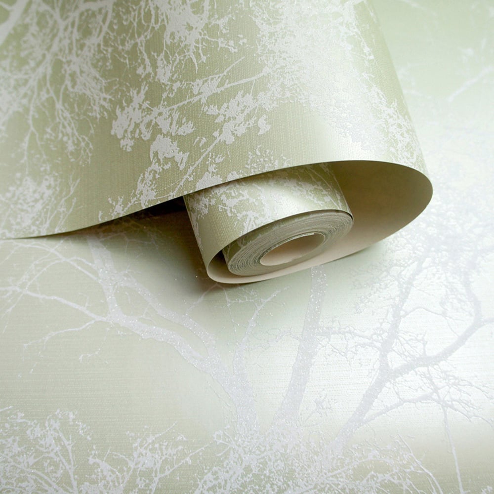 Add a calming touch to your home decor with the Holden Whispering Trees Green Wallpaper. It features delicate, textured trees that are infused with glitter and are set upon a green background with a subtle horizontal striped metallic sheen for added luxury. This wallpaper is printed using an FSC-certified substrate and it is spongeable with a paste-the-paper application. Each roll is 10.05m long and 53cm wide. Design match: 32cm offset match.