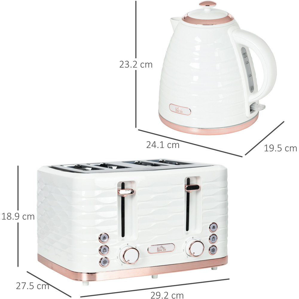 Prepare hot tea and a delightful breakfast with the HOMCOM 1.7L Jug Kettle and 4 Slice Toaster Set. The glossy and ridged textured finish with high-shine chrome accents adds a touch of elegance to your kitchen. This set features a 3000W 1.7L kettle with an Otter thermostat and water level indicator that enables rapid boiling for making up to six standard cups of tea or coffee in a singular boil. The toaster features a removable crumb tray with seven different browning levels to create the perfect toast. The defrost, reheat and cancel options enable you to toast or warm up frozen or forgotten slices, making your morning schedule more convenient. This stylish and functional set with a pebbled-indented design is ideal for all types of kitchen spaces.