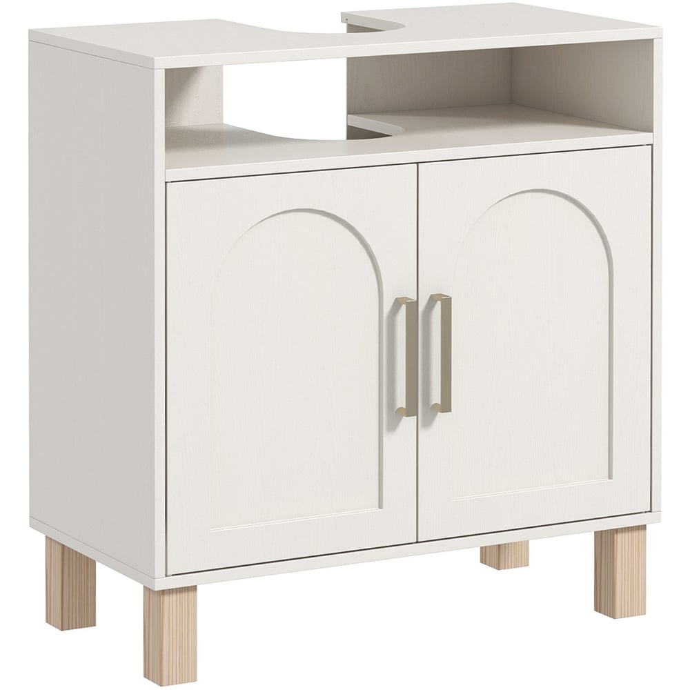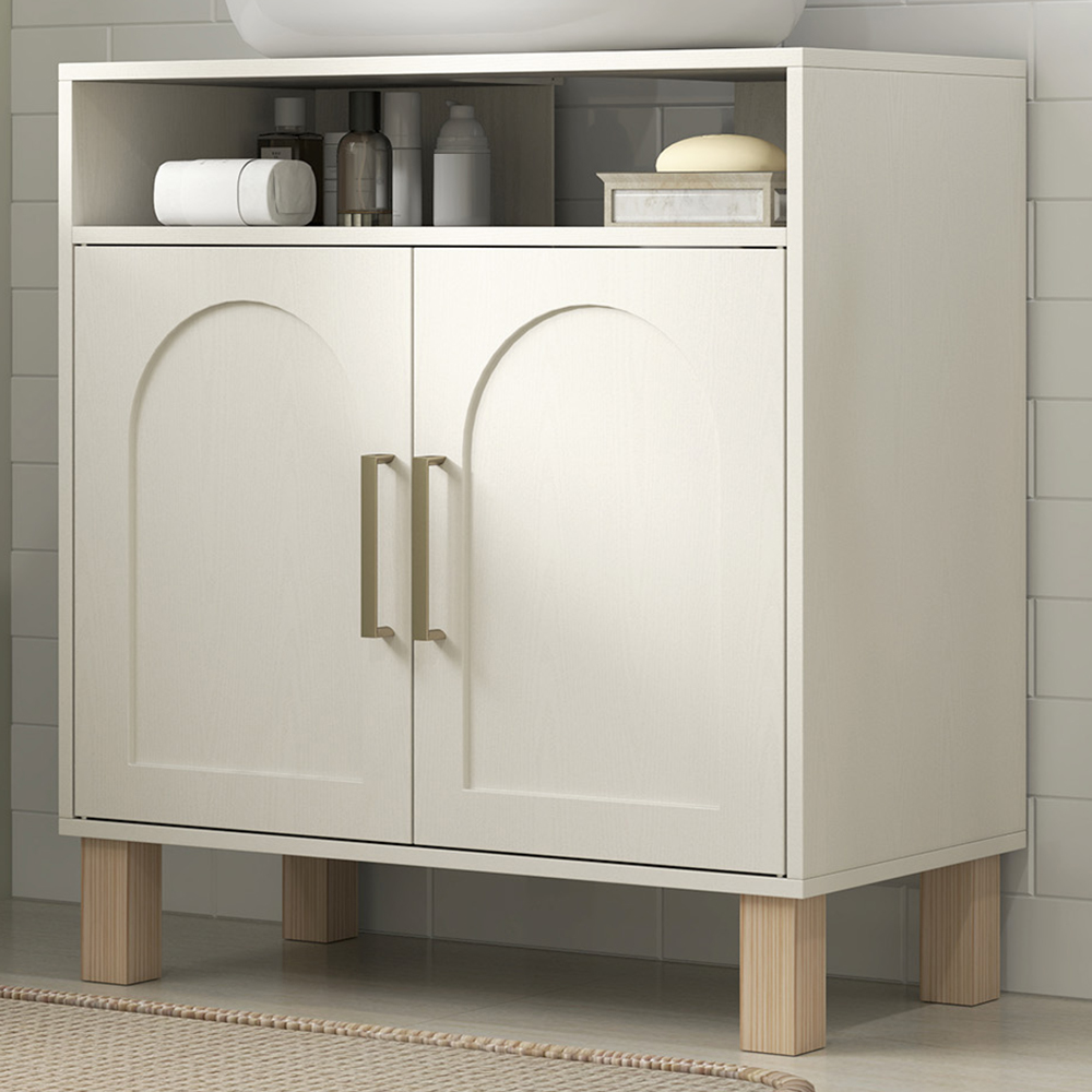 Brighten up your bathroom and keep it organised with a cream under sink vanity unit designed for basins without a pedestal, offering clever storage and a fresh finish. Enjoy the convenience of a pre-cut U-shape slot that fits seamlessly around wall-mounted hose outlet sinks, while an open shelf and adjustable two-tier cabinet help you store everything from toiletries to cleaning supplies. Finished in cream white with arched recessed door panels and bar handles, this bathroom storage cabinet fits perfectly under basins without a pedestal and adds a touch of charm to your space.