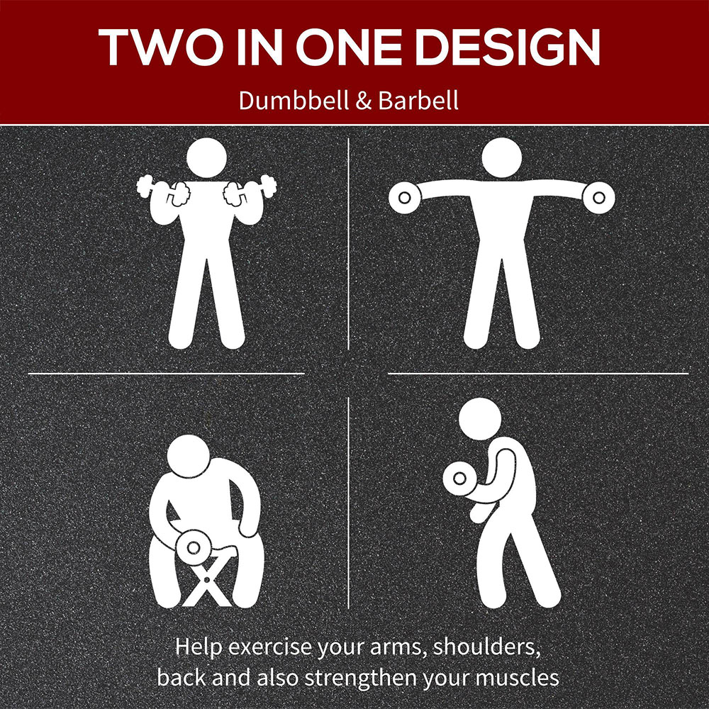 This two-in-one dumbbell set from HOMCOM, can be used as dumbbell or barbell - it's super easy to switch up your routine whenever you desire. Comes with: 12 plates and 3 rods - you can build up the weight you want - suitable for beginners and experts. The combination of both dumbbell and barbell makes it suitable for a variety of upper and lower workouts, like bicep curls, squats, presses and raises. A great way to start your fitness journey.