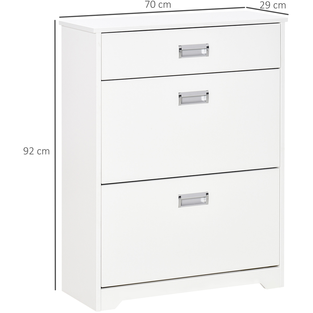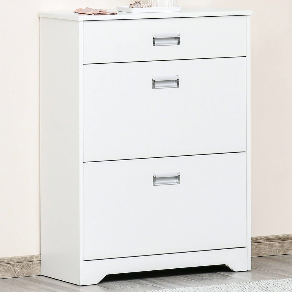 Organise your shoes properly with this HOMCOM 3 Drawer White Tipping Shoe Cabinet. Constructed of quality particleboard, this modern-style shoe organiser can be the ideal choice to add an eye-catching piece to your home decor. The cabinet has two flip doors and a top drawer with built-in handles for easy opening and removing your shoes. Its smooth countertop provides extra display space for keeping keys, bags, ornaments, etc. The cabinet also has a two-level adjustable and removable shelf in each suit tier for storing shoes of various sizes and types. Each tier can hold four pairs, and the white shoe cabinet can hold up to 16 pairs.