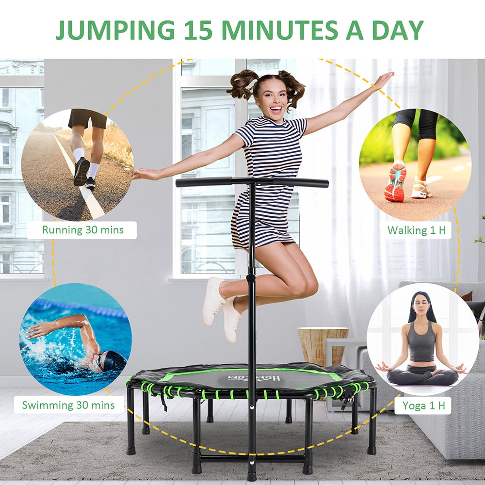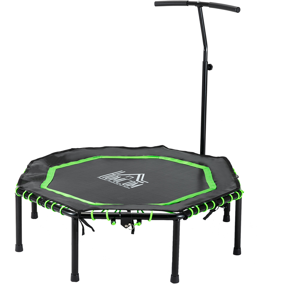 Bounce your way to a fitter lifestyle, whether it's in your office or in your home, thanks to these indoor trampolines for adults from HOMCOM. Using anti-rust steel for the frame, the hexagon frame is made into a spacious 122cm x 122cm, where a three-level adjustable handlebar gives you support and balance for safety. Made from coated polyester, the bouncing mat is tough and durable and is connected to the frame via a multitude of cords for you to bounce comfortably and safely. Non-Spring Design: Rebounders are crafted for a silent, low-impact bounce, making them gentle on your joints. Great for both gym and indoor use, they enhance your exercise experience by ensuring a quiet setting. HEAVY-DUTY CONSTRUCTION: Fitness trampoline is made of anti-rust steel with an all-weather PP jumping mat, steel leg base with rubber caps to protect your floor and reduces unwanted noise. Connected to the hexagon frame for safety. FOLDABLE DESIGN: This lightweight rebounder trampoline for adults with compact folding size suits most trunks and for your to move and store easily.