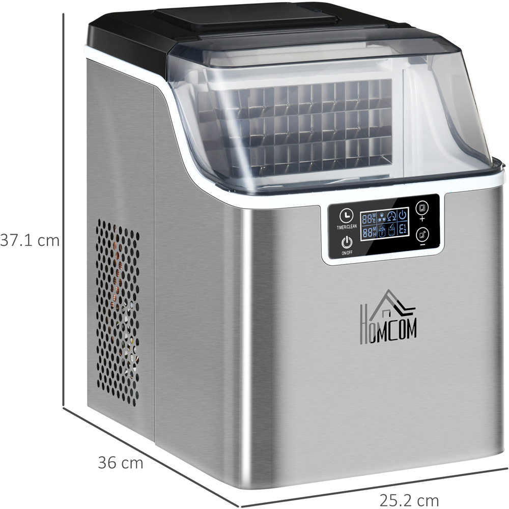 Keep your drinks call with the HOMCOM Silver Ice Cube Maker 3.2L. It is a convenient appliance that can quickly produce ice cubes for your drinks. With the ability to make 24 cubes every 18 minutes and up to 20kg in 24 hours, it is perfect for summer parties, BBQs, and events. You can easily customise the size of the cubes to suit your needs, whether for cocktails or regular drinks. The LCD display makes operation simple by indicating water levels, ice-making status, and more. Additionally, the automatic cleaning function saves time and ensures the ice maker is ready for the next use, making it a great tool for cleaning up after gatherings. Model no: 800-139V70.