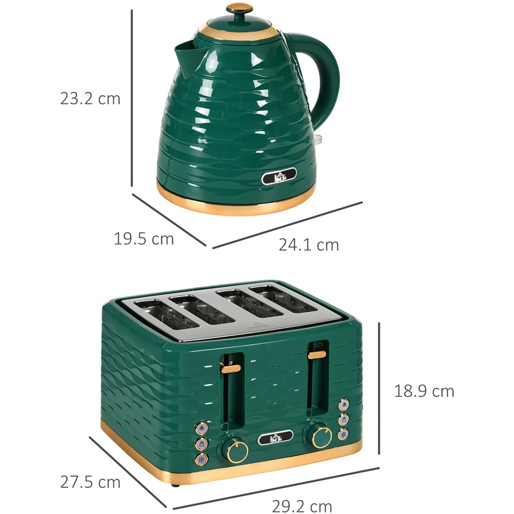 Kickstart your mornings with the HOMCOM 800-162V70GN Green 3000W Kettle 1.7L and Four Slice Toaster Set. This 3000W green-coloured set comes with a 1.7-litre rapid boil kettle and four-slice toaster, which has a ridged texture with a glossy finish, completed with a chrome-coloured accent for a chic, polished look. The toaster has seven browning levels with defrost, reheat and cancel options. Meanwhile, the water kettle can make up to six cups of tea and has a water level indicator, thermostat and a handle, making it a great option when your friends come around and you want a catch-up.