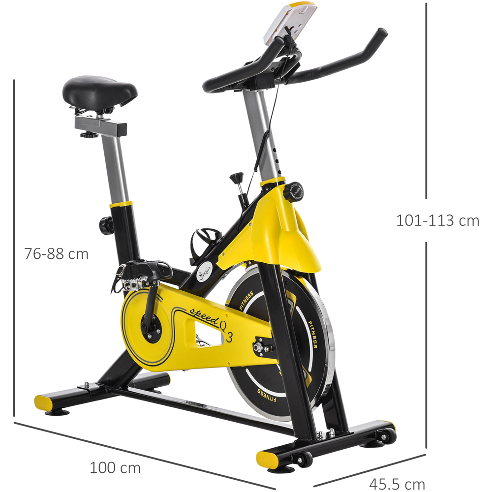 Improve your fitness at home with this HOMCOM exercise bike. Its upright design stands steady, with the two wheels allowing it to be moved easily for storage. This static bike features a resistance knob, so you can adjust the intensity to suit you. The LCD screen displays time, speed, distance and calories burnt, making it easier to achieve your goals. Using heavy-duty steel with a belt-driven system and flywheel, this slim cycle keeps stable and balanced when in use. Adjustable: Seat and handlebar sets to five different levels, making this indoor bike suitable for people between 4-6ft. Controlled resistance: Intensity can be adjusted via the tension knob – ideal for beginners and advanced bikers. This cycling machine is great for pushing yourself further when needed. Sturdy structure: Made from steel, this gym bike is steady and solid, keeping balanced when in use. Aluminium pedals are lightweight and support your feet. Fitted with two wheels to move easily.